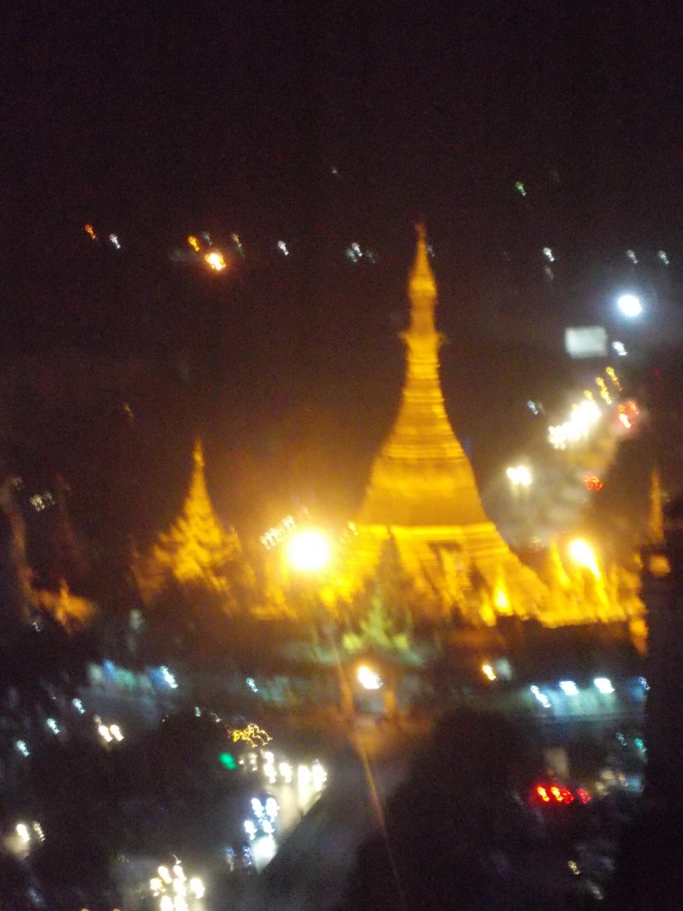 ヤンゴン中心地の都会にあります。トレーダーズホテルに宿泊しましたがその部屋からも見えました。入り口ではすずめを売る女性たちにからまれました。(写真を撮ろうとしたからかもしれません)入場料はそんなに安くありません。外国人価格です。光り輝き夜景はすばらしいです。
