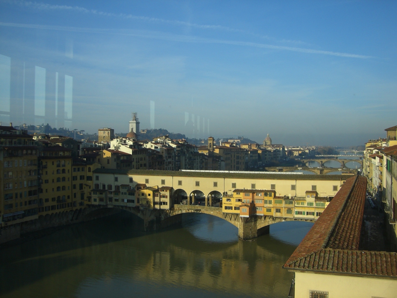 アルノ川沿いに建っているので、ウッフィッツィ美術館からはアルノ川とヴェッキオ橋が綺麗に間近に見れます。2階だての独特の形のヴェッキオ橋にはには金細工の店が並んでいて、観光客がたくさんいました。橋の上から見るアルノ川も素敵です。