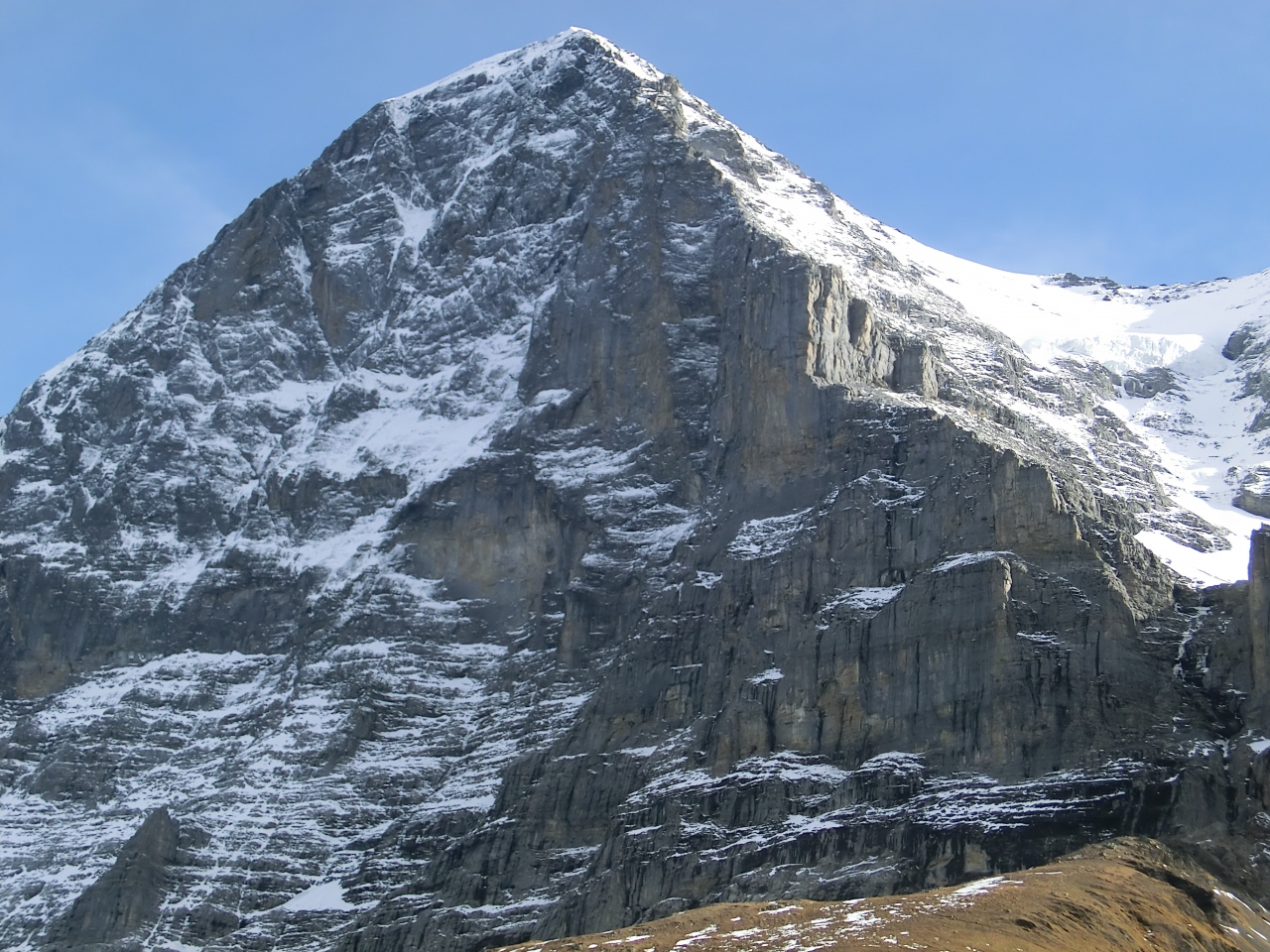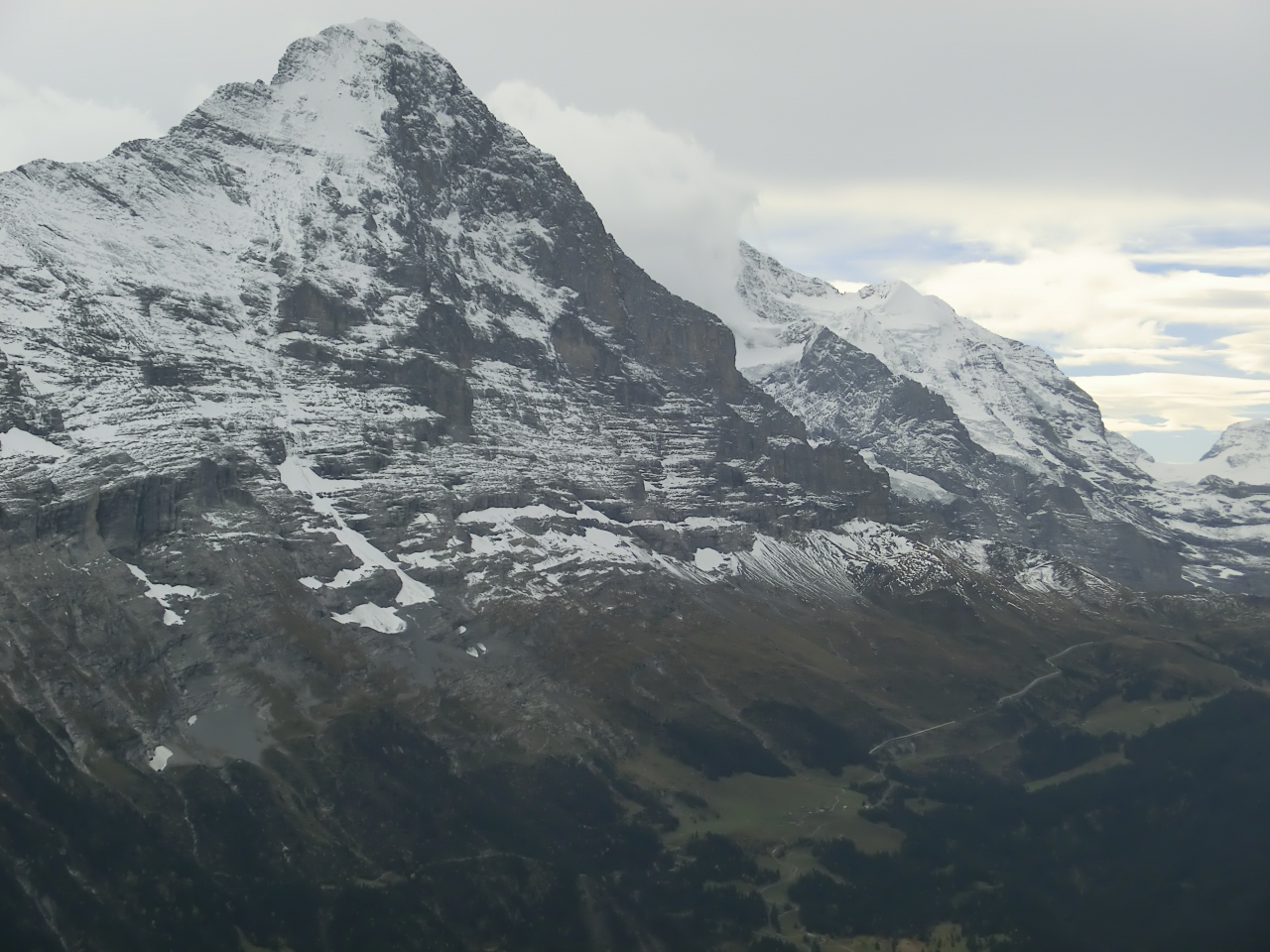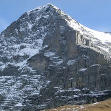グリンデルワルトはアイガーの真下の町です。あまりにも近くにあるのでグリンデルワルト駅に降り立った時にびっくりしました。ホテルの窓からもみえました。夜になると右側の中ほどに小さな電気がつきます。アイガーの中にある駅の電気でしょうか?フィルストから見ると真正面に迫ってきますし、アイガーの下を歩くハイキングコースからは覆いかぶさるようなアイガーが臨めます。。