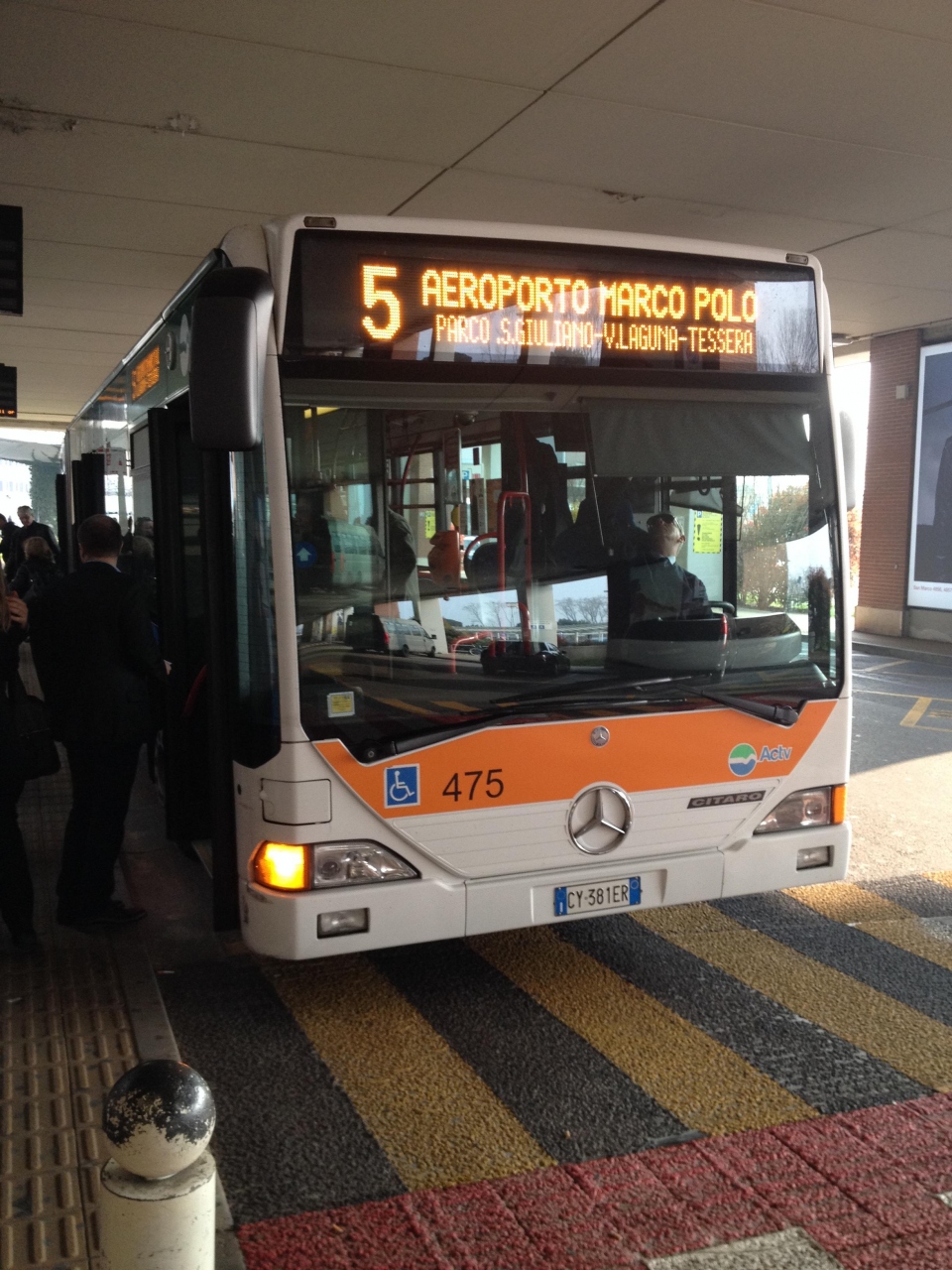 ローマ広場までバスで行こうとマルコ・ポーロ空港のACTV社のカウンターへ行きました。ヴァポレット24時間券は20ユーロ、ローマ広場までのバス片道込みだと24ユーロ、バス往復込みだと28ユーロでした。バスはオレンジ色の5番のバスになります。