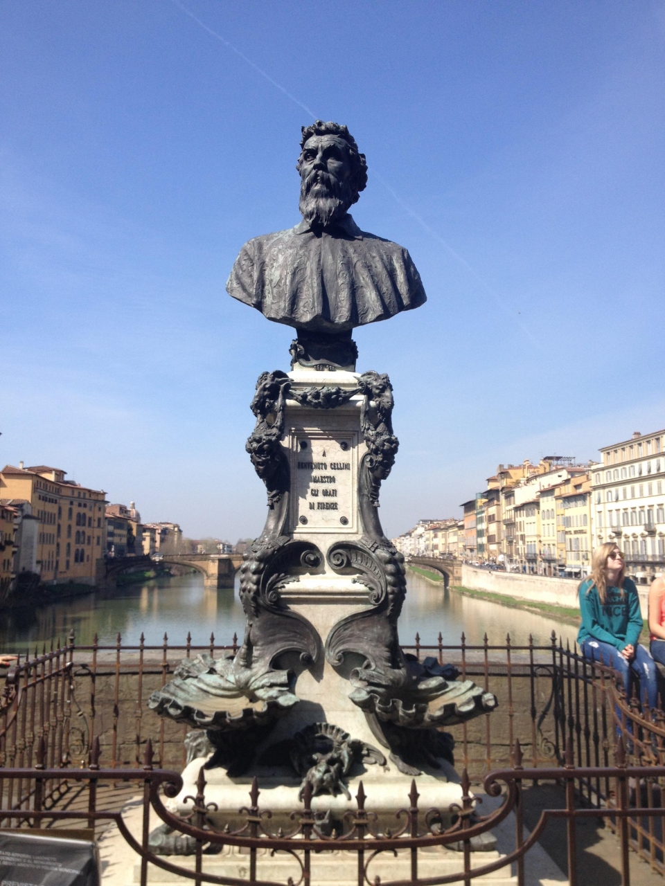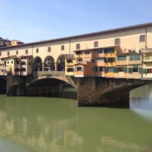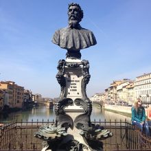橋といっても両側は2階建てになっており、1階は貴金属の店がずらりと並んでいます。離れてみれば橋なのですが、実際渡ってみるととても橋の上にいるとは思えません。なんとも不思議な橋です。橋の中央には金細工の父と呼ばれるチェッリーニの像があります。