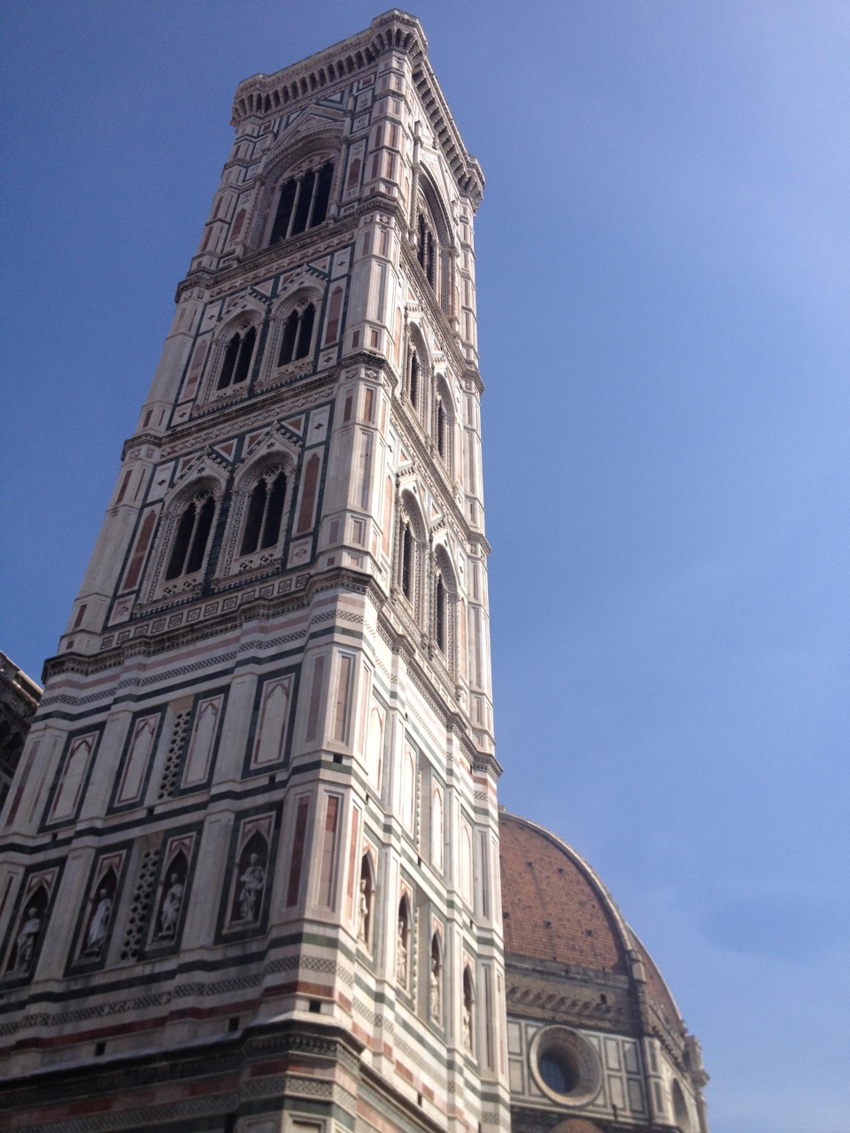 ドゥオモの脇に立つ高い鐘楼です。ぜひ見晴台まで行きたかったのですが階段が414段と聞いて、時間と体力を考えてやめておきました。エレベーターがあれば良かったんですけどね。外観を良く見ると各階層ごとに異なる様式で立てられているのがわかります。