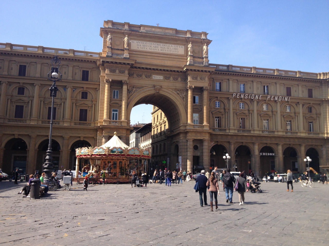 フィレンツェの街をふらふらと歩いていたらいつの間にかレプッブリカ広場に出ました。広場にはメリーゴーランドもあり、土産物売りやスプレーアート(絵画)の実演販売などで賑わっていました。広場の周りの建物もフィレンツェらしい雰囲気で良かったです。