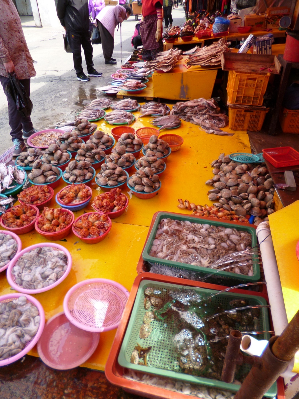 再開発で建てられたチャガルチ市場もありますがむしろ西側に広がる水協チャガルチ共販市場やテントを張って売り場にしている昔ながらの屋台街等が楽しめますが、買い物はやめておいた方が良いでしょう。現地の人とウリマル(韓国語)で喋る事が出来る人ならともかく、一般の方は絶対に高い買い物になります。目の前で地元の人が買ったものをその後すぐに値段交渉をすると全然違う値段を言われたり当たり前です。普通に買うなら地下鉄出口近くにあるハナロマートの1階で海産物を買う事をお勧めします。チッポ(カワハギの干物)や韓国海苔、スルメ等はここで買うのが一番適切かと思います。ただ買い物する場合は自分でレジバッグ等をご持参下さい。