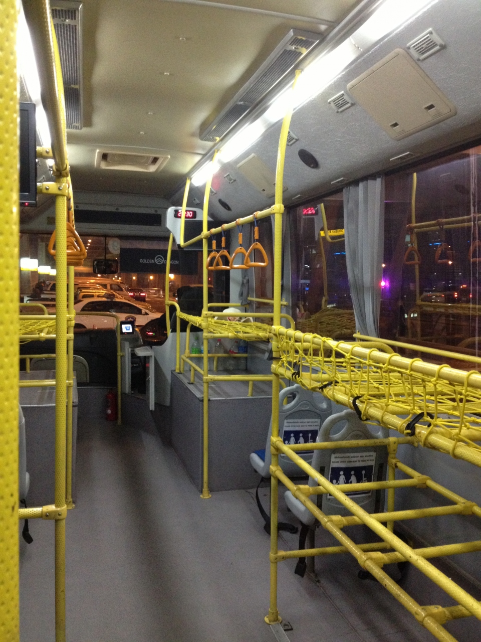 バスに乗るには、翌日の飛行機のチケットを見せるだけでよいです。深夜に近い時間だったので、お客は私たちだけでした。30分おきに出ているようです。
