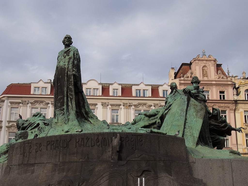 その一角に、チェコの英雄のヤン・フス像があります。世界史を習ったことがある人なら聞いたことがある名前ですが、チェコで宗教改革を行おうとして、ローマ教皇に火あぶりにされた人です。