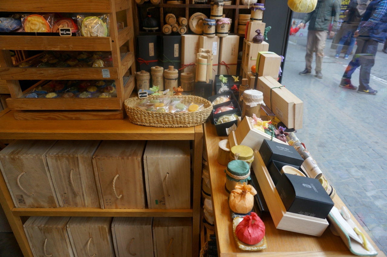 民芸調のポーチや、個性的な器、ゆず茶などが楽しめる風情のあるカフェなど、どのお店に行っても楽しめます。