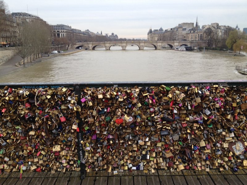 ナポレオン1世がルーブル宮に直接入れるように架けたパリ最古の鉄橋・・ということで歴史的意義のある橋ですが、南京錠がびっしりとかけられ様変わりしてしまっています。これを批判する向きもいらっしゃるようですが、景色は移ろいゆくもの、これはこれでもはやパリの一部となっているのかな・・と思います。もはや新たな南京錠が掛かる場所はないのでは?というくらいぎっしりですが、もし恋人と一緒なら、路上で南京錠を売っていますから購入し、かけてみるのもいいかもしれませんね。(もちろん日本で買っていったほうが南京錠は安価に手に入るかと。)
