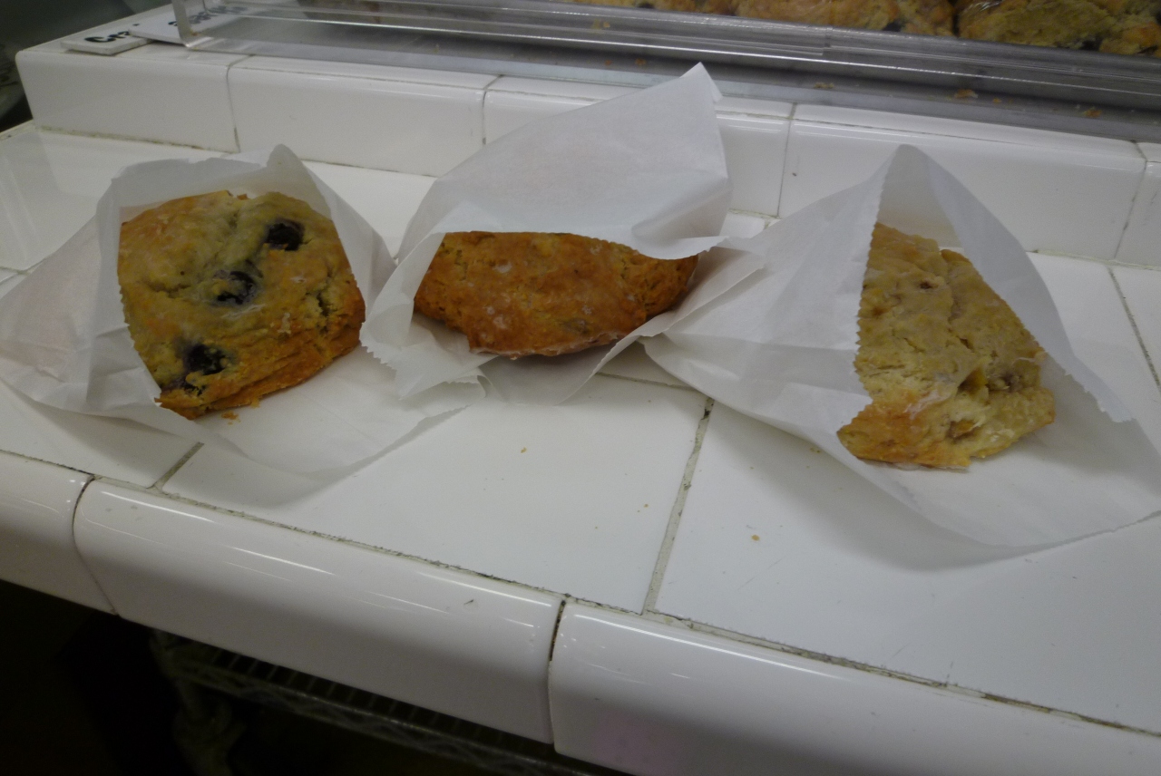 人気のスコーンは、ブルーベリーとバナナの2種類しかなくて、中にいた人が、「すいませんね。今は2種類しかなくて」と言っていました。他にどんな種類があるのかは知りませんが、迷わなくてよかったです。ブルーベリーもバナナも買いました。