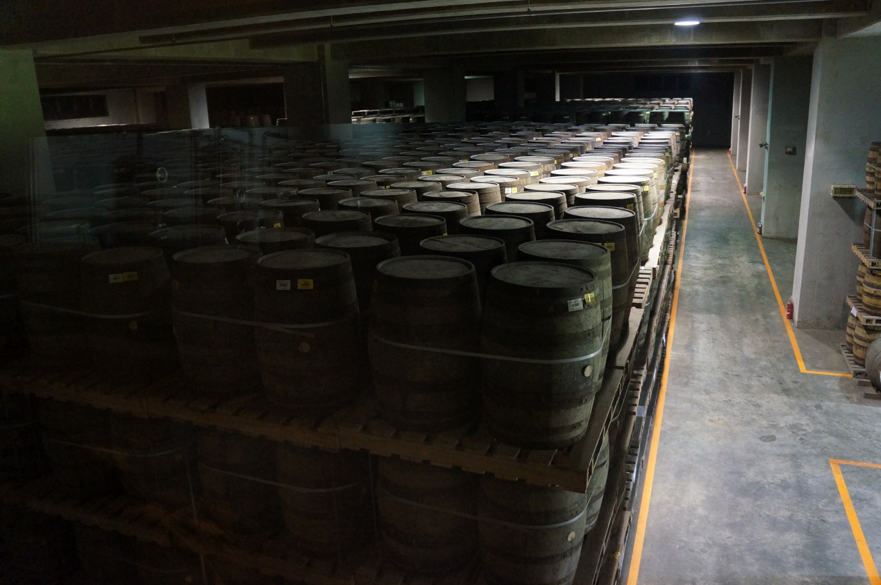 糖化させる樽?や蒸留器を見学。最後には沢山のウイスキー樽がガラスの向こうにあります。