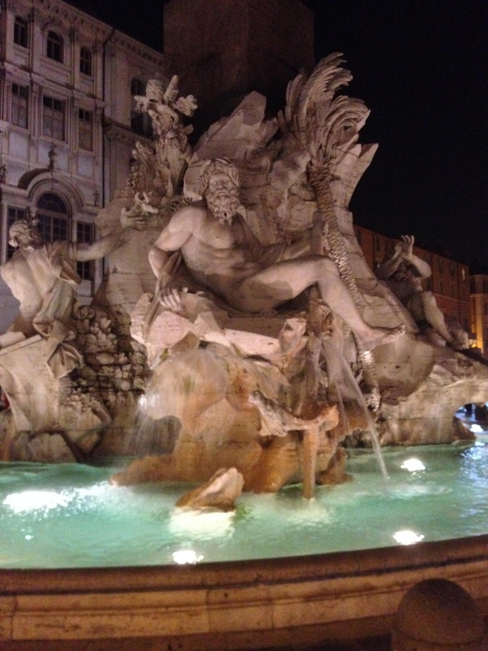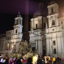 トレヴィの泉からパンテオンの前を通ってさらに真っ直ぐ進むとナヴォーナ広場に出ます。広場には噴水が3つあって、なかでも真ん中の四大河の噴水がライトアップされており、とても美しかったです。広場には夜でも大勢人がいて、物売りなども多く見ていて飽きませんでした。