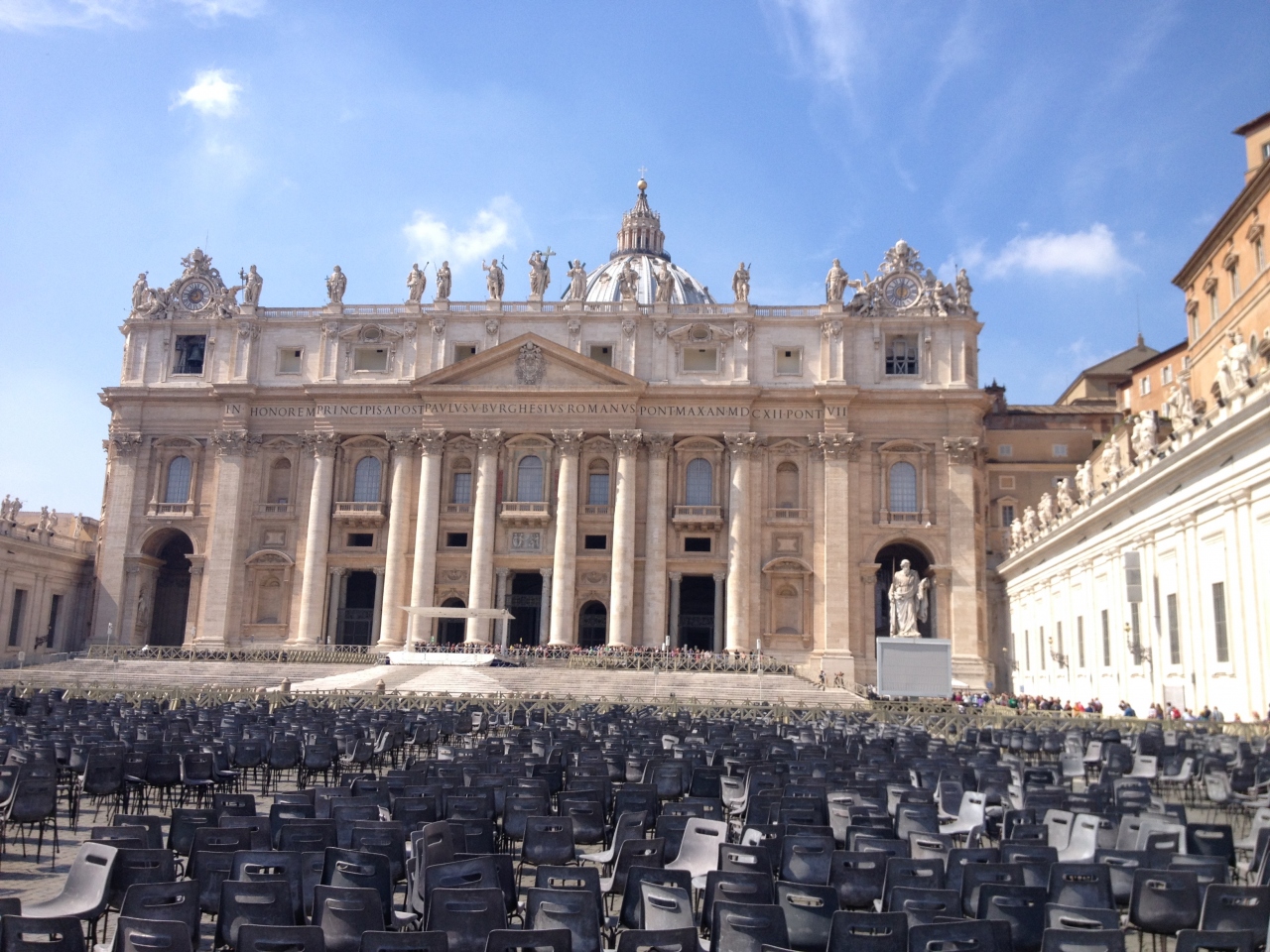 円形の壁に囲まれた広大な広場です。壁の上部には美しい彫刻がたくさん並んでいました。サン・ピエトロ大聖堂の前には大量の椅子がおいてありました。おそらく行事の際に使われるのでしょう。陽を遮るものがないので、夏場に行かれる方は注意してください。