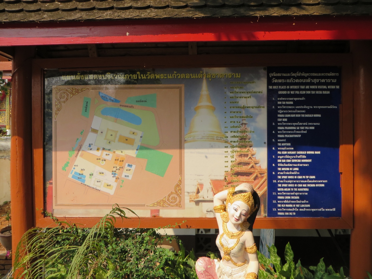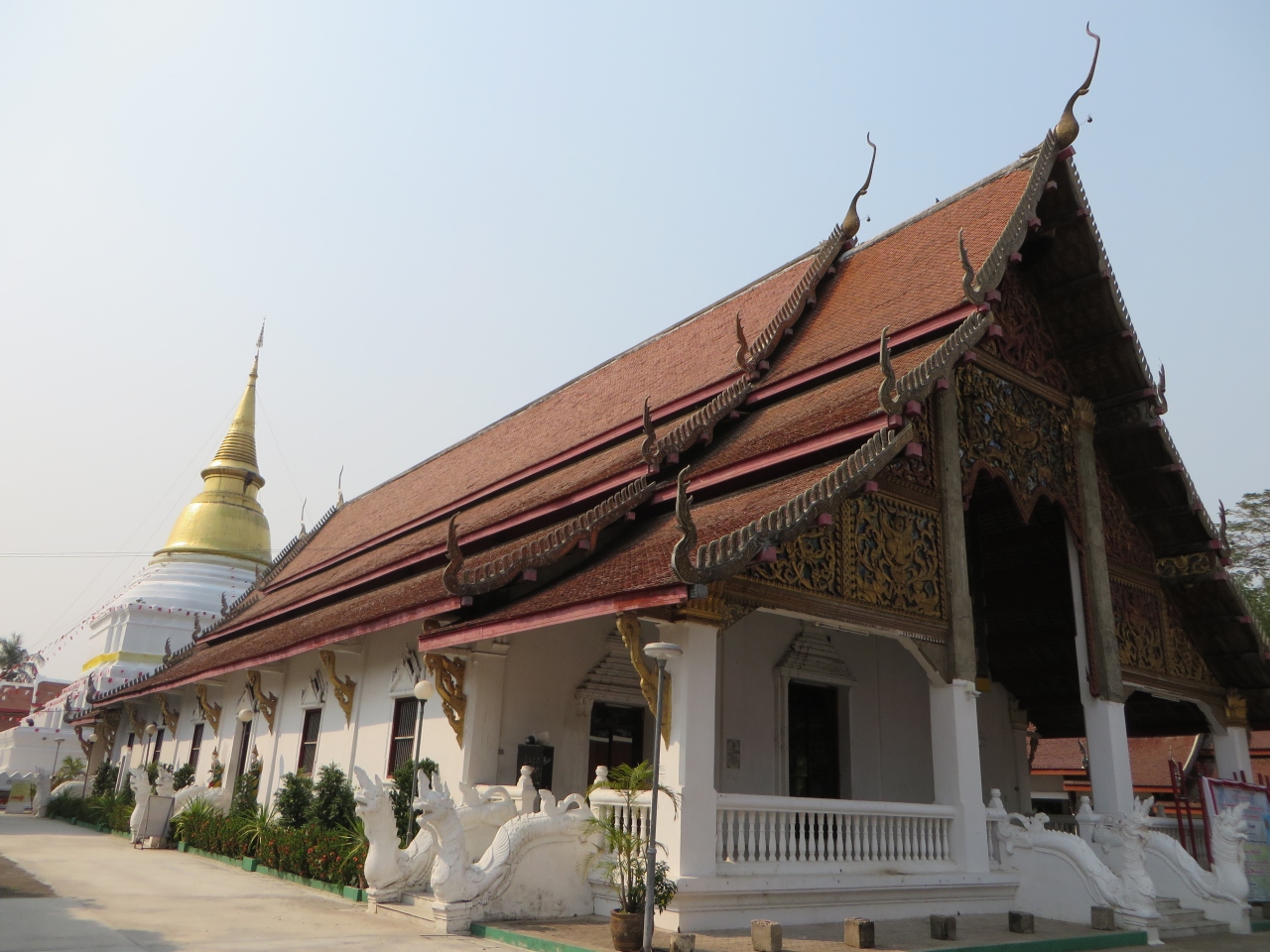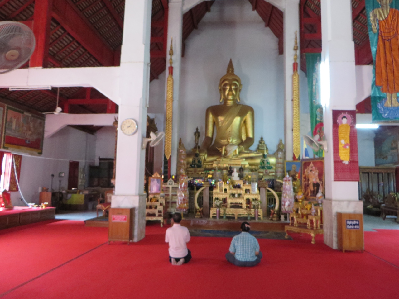 市街地の外れにあり本堂と仏塔は壁に囲まれ入るのに20B払いました。バンコクにあるワット・プラケオのエメラルド仏を安置していたこともある寺院だそうですが、あまり観光客はいませんでした。高さ50メートルの仏塔、大きいです。木造本堂はビルマ風の重層屋根でこれも大きいです。仏塔の横には涅槃仏の建物がありました。本堂をゆっくり1周、布袋さんのような像や動物の像等がありました。本堂の正面は開いておらず横から入りました。2人が拝んでいました。本堂内に入る人はあまりいないようで暗かったです。小さな博物館があるようですが見ませんでした。残念です。なお、この地はスイカWATERMELONの産地のようでスイカを持っている女性の像が敷地入口横にありました。