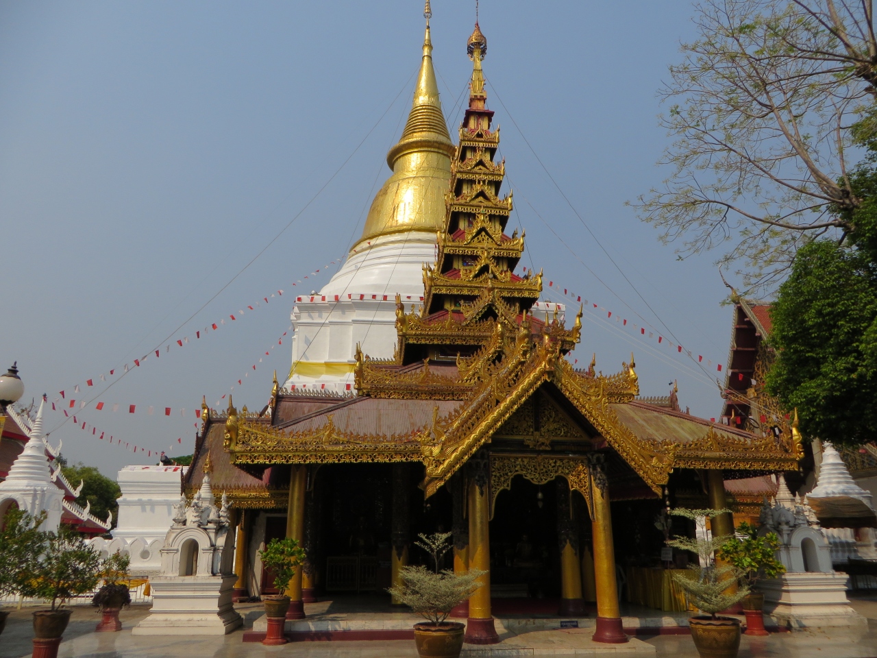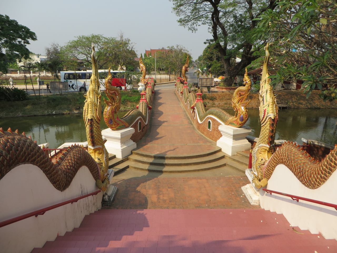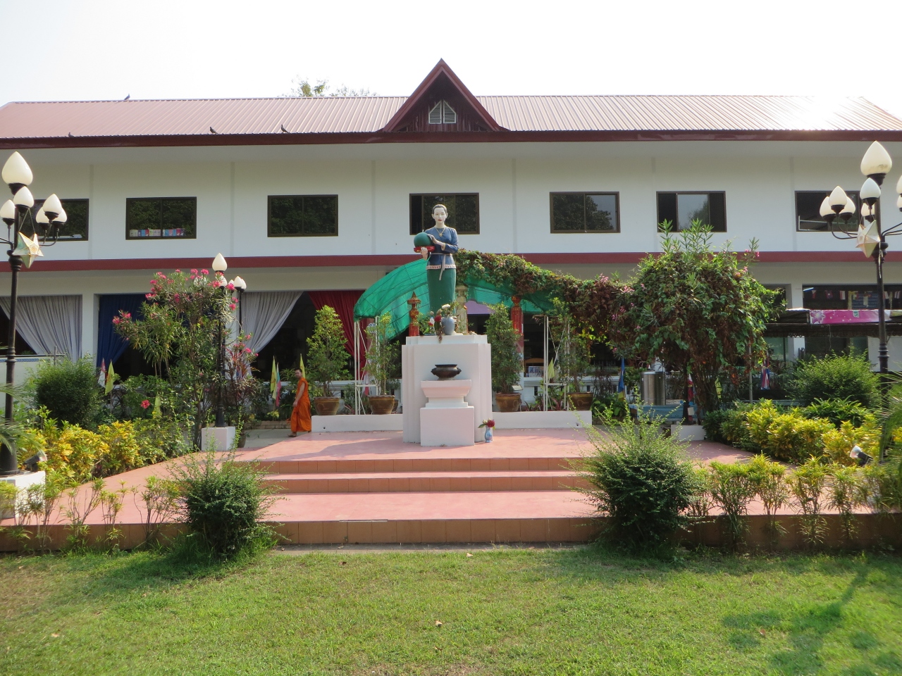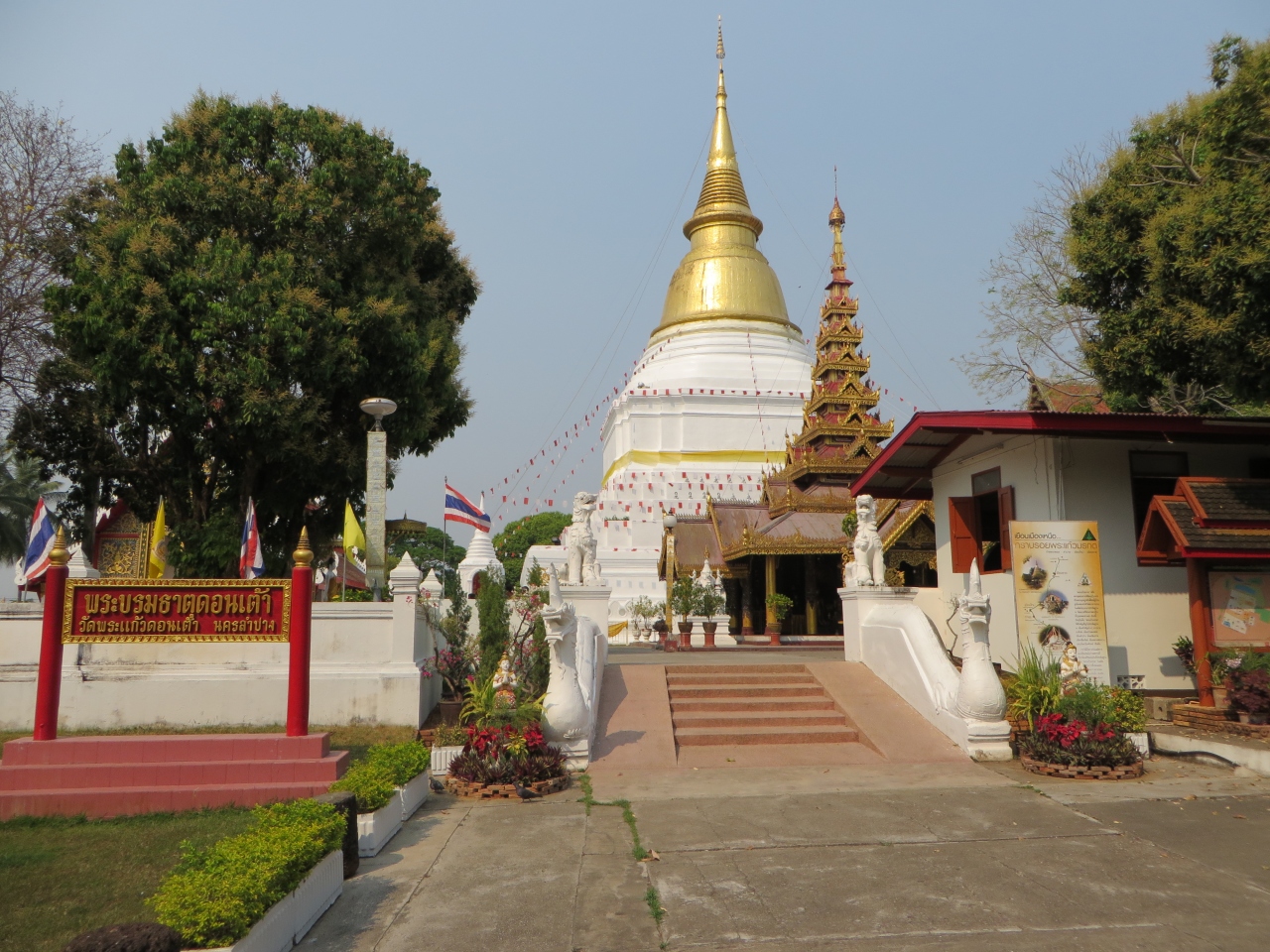 市街地の外れにあり本堂と仏塔は壁に囲まれ入るのに20B払いました。バンコクにあるワット・プラケオのエメラルド仏を安置していたこともある寺院だそうですが、あまり観光客はいませんでした。高さ50メートルの仏塔、大きいです。木造本堂はビルマ風の重層屋根でこれも大きいです。仏塔の横には涅槃仏の建物がありました。本堂をゆっくり1周、布袋さんのような像や動物の像等がありました。本堂の正面は開いておらず横から入りました。2人が拝んでいました。本堂内に入る人はあまりいないようで暗かったです。小さな博物館があるようですが見ませんでした。残念です。なお、この地はスイカWATERMELONの産地のようでスイカを持っている女性の像が敷地入口横にありました。