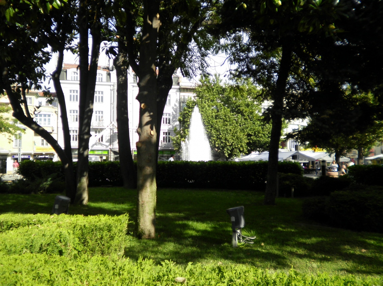 歩行者天国の一角に大きな噴水がある大きな広場=ステファン・スタンボロフ広場