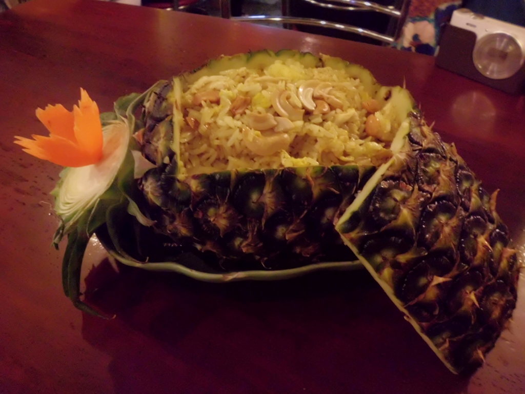 通りにそってレストランが並んでいますが、その中の1軒のダン・レストラン。タイ料理がメインのお店です。オープンな雰囲気です。パイナップルの器に入ったチキンチャーハンは薄味のカレー味で(炒められたパイナップルも入っています)、見た目にも豪華でおすすめです。