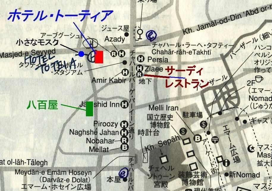 - イスファハンのメインストリートのチャハルバーゲ・アッバスィー通りと金曜モスクへの通りと交差する辺り。BP御用達のアミールカビールホテル対面。