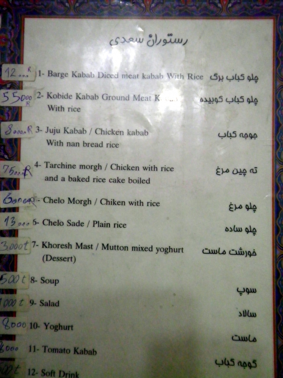 - チェロカバを食べてみたが、味のほうはもうひとつだった。だいたい英語メニューの料金表示がでたらめだった。