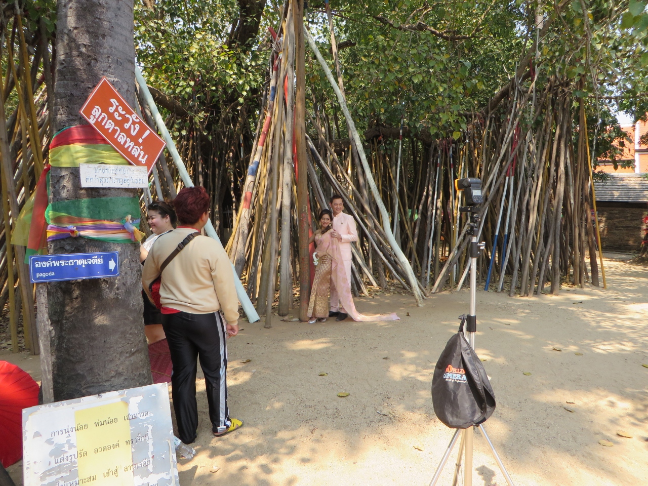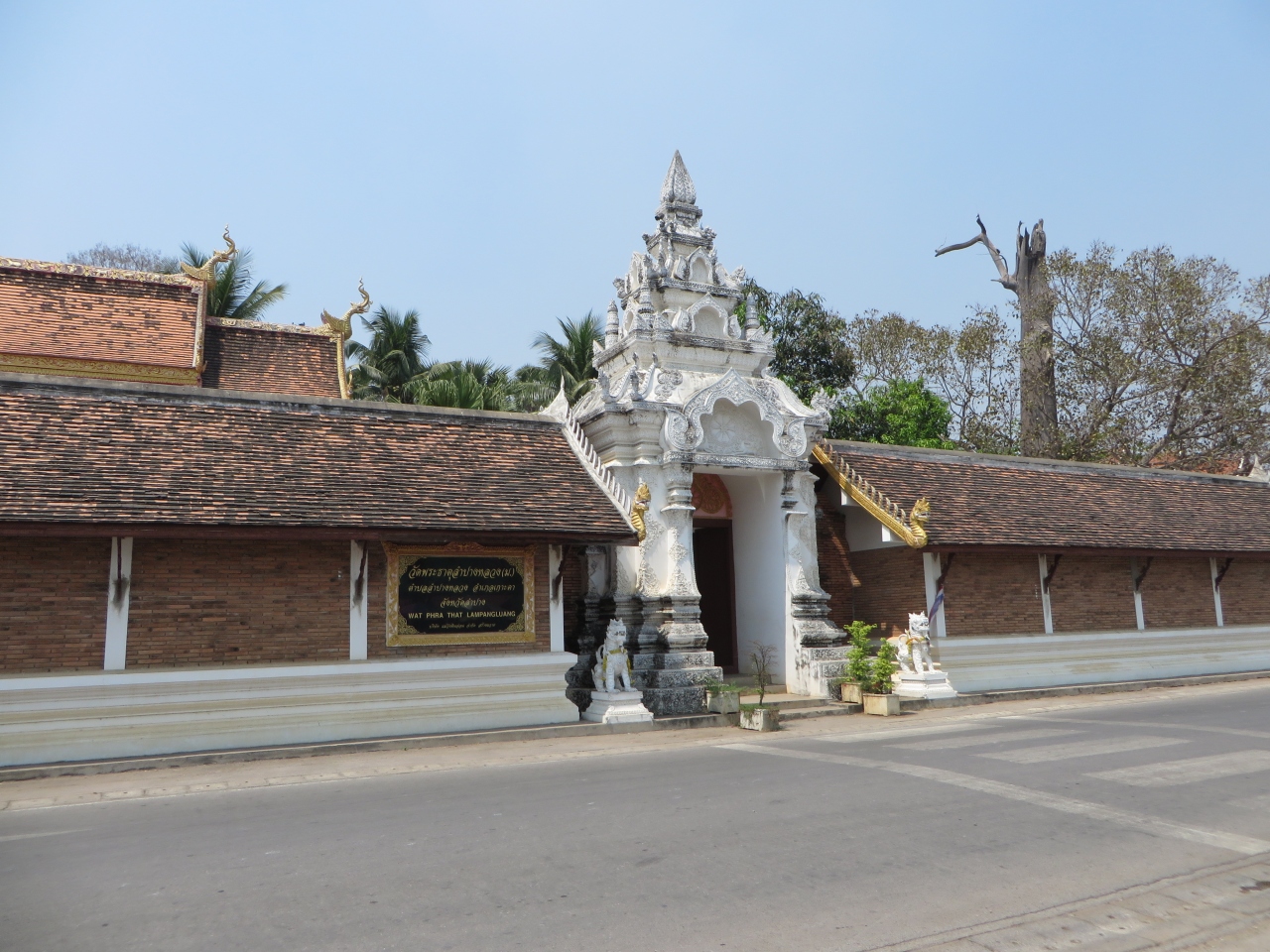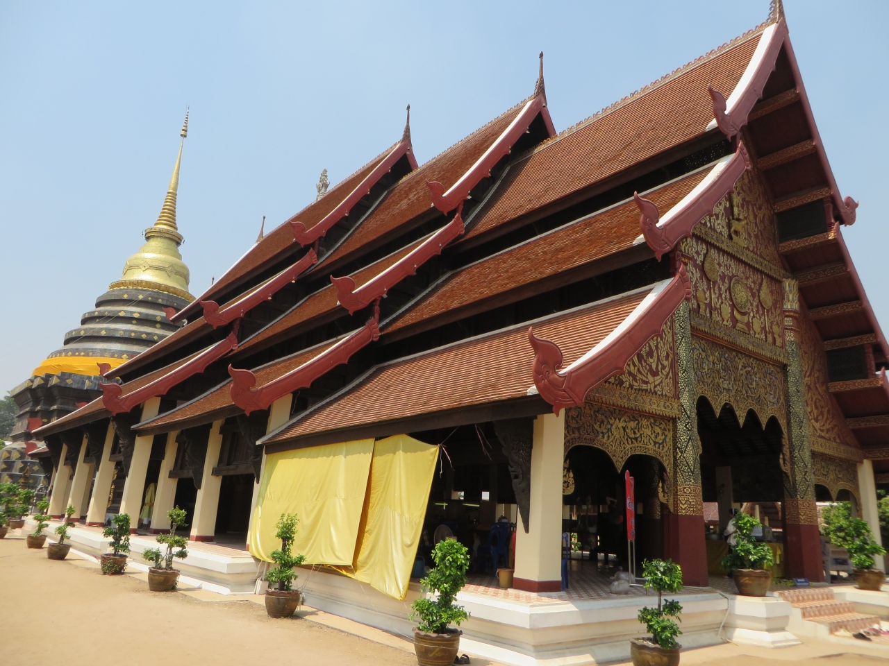 ランパーンの中心部からは離れています。敷地は広いです。駐車場から道路を横断し参道の階段を登って行きます。着いた正面に大きな本堂がありました。大きな3層屋根の本堂、15世紀半ばに建てられタイ国内に現存する最古の木造建築の1つと言われています。奥には黄金の仏塔があり、仏像が納められているそうです。小学生の一行がお参りにきていました。また本堂の後ろには高さ45メートルの仏塔と凄いです。大勢の人が来て賑やかです。僧侶も来ていてお参りしていました。仏像は仏塔の左の堂にあります。その左、塀の向こうにも建物があり僧侶の住居等となっているようです。結婚式を控えたと思われる若い2人が記念写真を撮っていました。幸せなのでしょう、お嫁さんがVサインをしていました。日本でも同じ光景を見たことがあるような気がします。