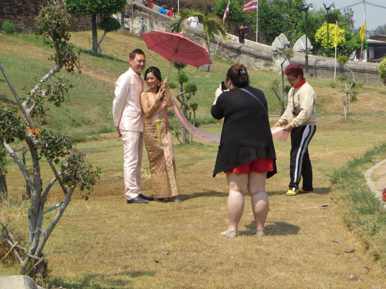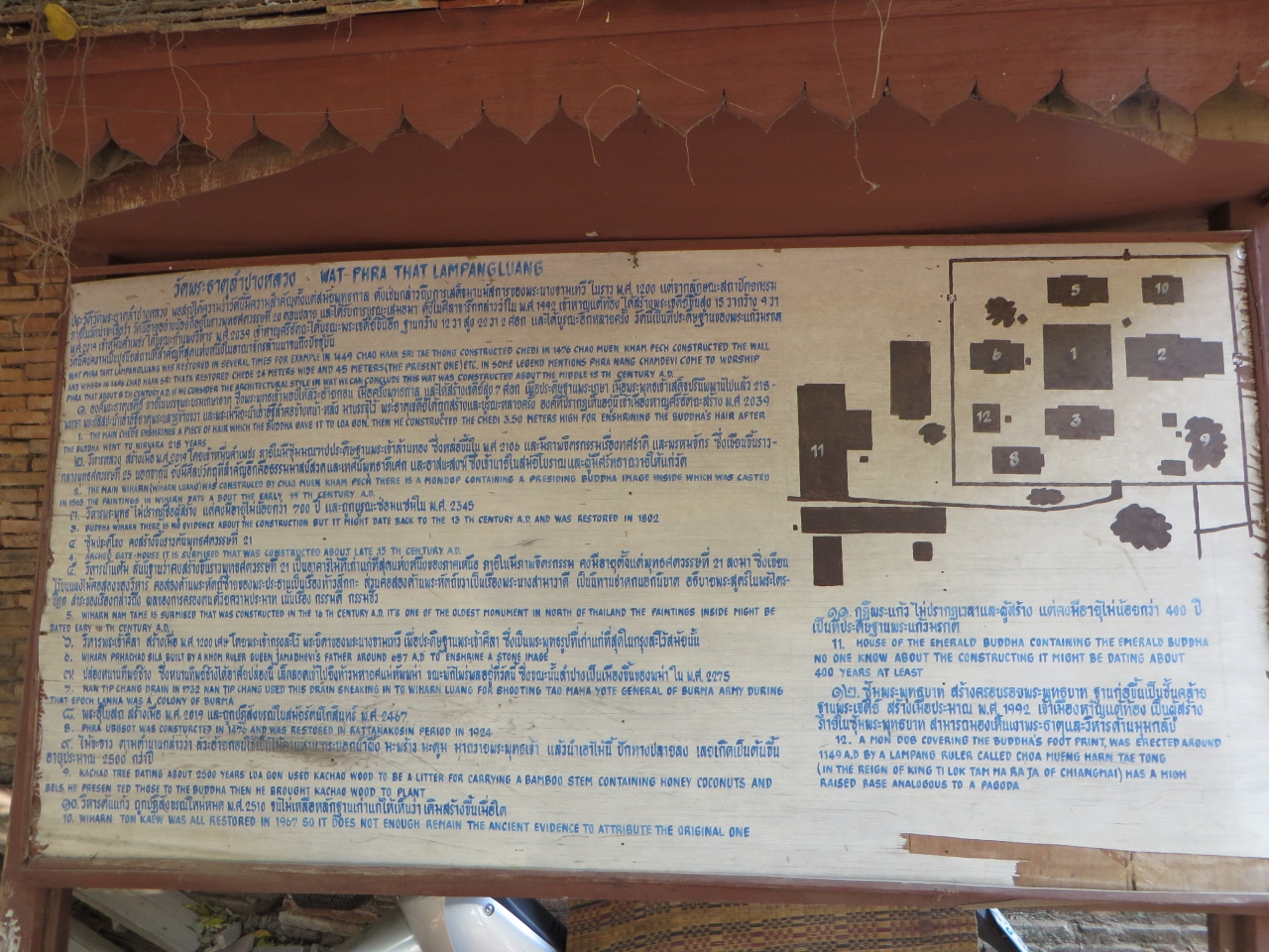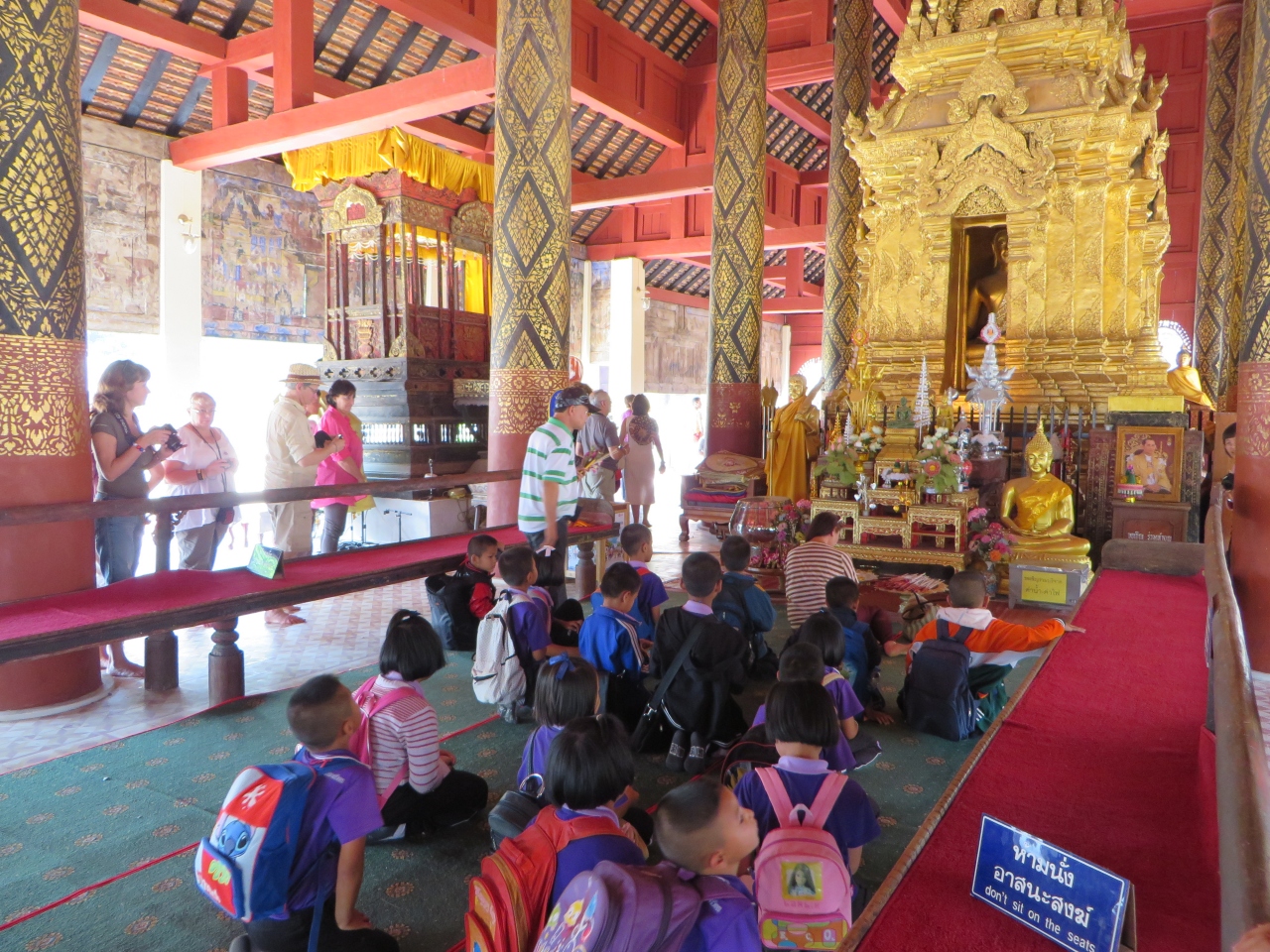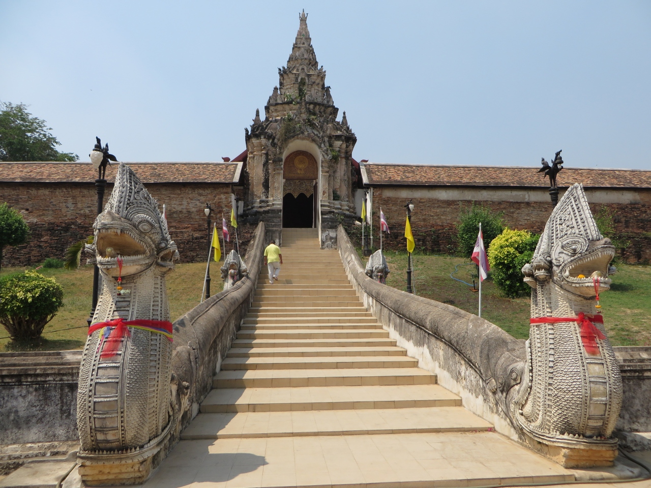 ランパーンの中心部からは離れています。敷地は広いです。駐車場から道路を横断し参道の階段を登って行きます。着いた正面に大きな本堂がありました。大きな3層屋根の本堂、15世紀半ばに建てられタイ国内に現存する最古の木造建築の1つと言われています。奥には黄金の仏塔があり、仏像が納められているそうです。小学生の一行がお参りにきていました。また本堂の後ろには高さ45メートルの仏塔と凄いです。大勢の人が来て賑やかです。僧侶も来ていてお参りしていました。仏像は仏塔の左の堂にあります。その左、塀の向こうにも建物があり僧侶の住居等となっているようです。結婚式を控えたと思われる若い2人が記念写真を撮っていました。幸せなのでしょう、お嫁さんがVサインをしていました。日本でも同じ光景を見たことがあるような気がします。
