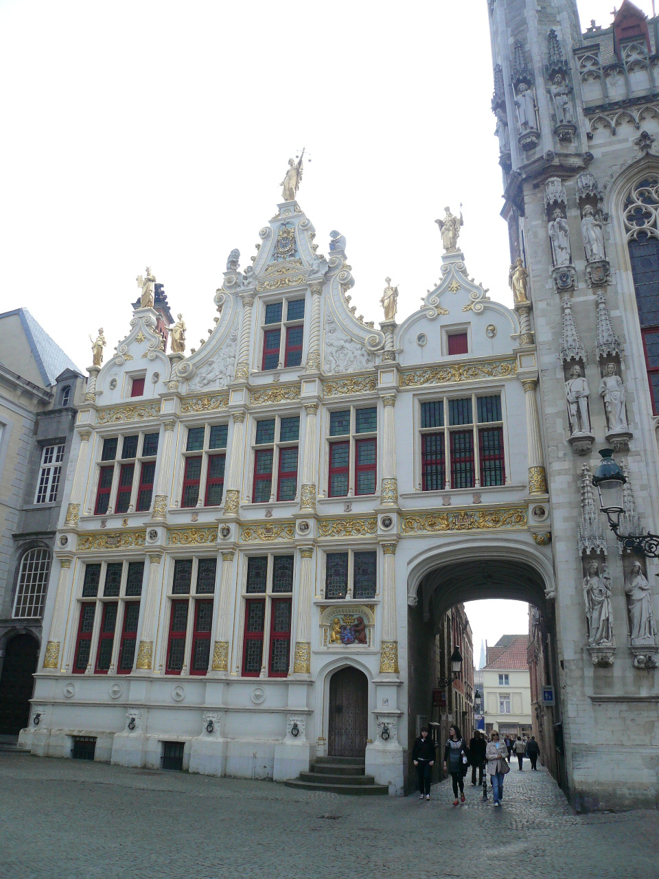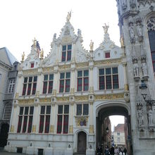 ブルージュの町の中心にブルグ広場があります。ブルグ広場に面して聖血礼拝堂、市庁舎があります。その市庁舎の隣が公文書館/自由ブルージュ博物館です。正面に正義、向かって右にアーロン、左にモーゼの像があります。建物の1階部分は、通り抜けできる通路があり、形がユニークです。