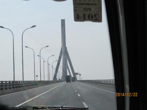 滴水湖は何も見る物が無いので東海大橋へ行く事にしました。洋山専線は東海大橋を通ってコンテナヤードの小洋山まで行きます。待っても来ないのでワゴン車の乗合白タクに乗って行きました。バス代は12元、白タクは20元ですので良心的な値段です。因みにタクシーに聞いたら120元だそうで6人で割れば20元です。行は良い良い帰りは恐い、帰りのバス停まで2km程歩き、、2時間程待たないとバスは来ない、食事をする所も無く観光に行く場所ではありません。上海市内から片道3時間以上掛けてコンテナを見