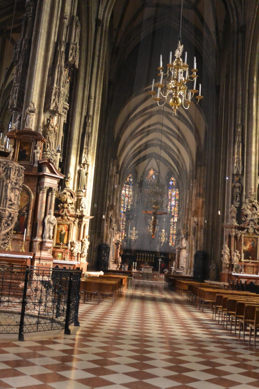 旧市街にある世界遺産のシュテファン寺院。ゴシック様式の寺院です。137mもあるという尖塔にモザイクの屋根瓦と素晴らしいです。寺院前にあるカフェに行くと瓦がしっかり見れると添乗員さんが言っていました。寺院内は厳かな雰囲気です。塔にも登れるようです。
