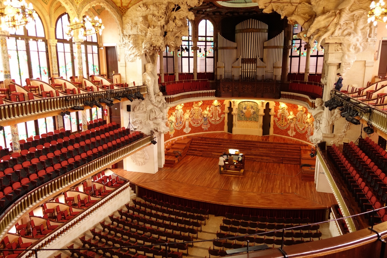 英語とスペイン語のガイドがあります。日本語はありません。案内人によるツアーで50名程度の団体で見学します。音楽堂の中は自由見学で、各自、好きなところで写真撮り放題です。見学時には夜の公演に備えてパイプオルガンの練習中でした。なかなかいい響きのホールと思いましたが、2階の両サイドからは舞台の一部が死角になってしまうのと椅子が固定式ではなく、普通のイスだったので音が立たないか気になりました。
