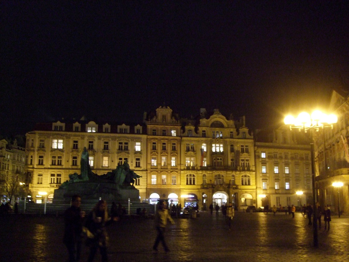 カレル橋からも歩いていける旧市街広場。広場にはヤン・フス像や市庁舎、教会などがあります。周りの建物もゴシック、ルネッサンス様式など色々です。夜でもなかなかの人出でにぎわっています。天文時計もライトアップされていますし、プラハは夜が綺麗な都市なので是非夜も足を運んでみてください。