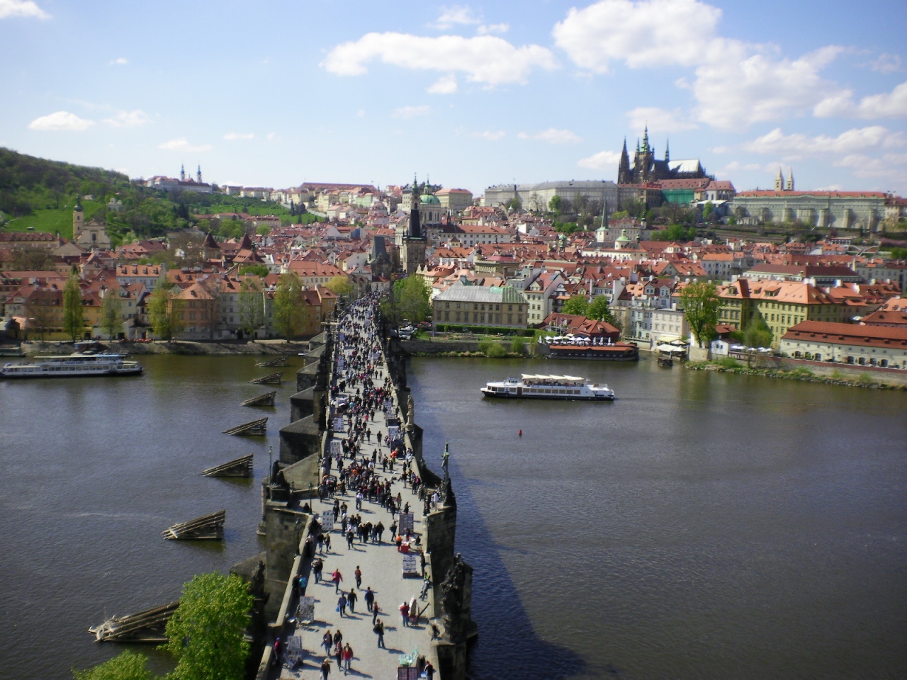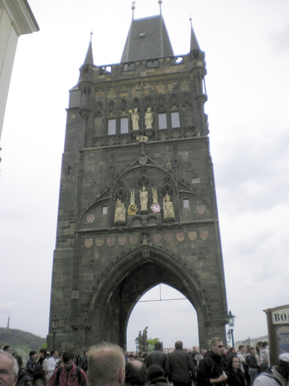 ひとり75コルナ(約380円)を支払い旧市街地橋塔に登りました。橋塔の上からは、クレメンティヌムの中の聖サルヴァートル教会正面のファサードの向こう側に、幾つもの塔が見え、「百塔の街プラハ」と言われるのがよくわかる眺めです。反対側は、ペトジーン公園の展望台、ロレッタ教会の2本の尖塔、カレル橋を挟んで聖ヴィート大聖堂、聖イジー教会と眺めることができ、この上もなく美しい風景に見とれてしまいます。