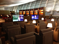 時間帯にもよるのでしょうが、入った時はかなり混んでました。内装は雰囲気のあるラウンジですが、ANAラウンジなどと比べると食事が物凄くプアーです。ろくな食事がありませんでした。サンドイッチ、スパゲッティなどしかないです。あまり美味しくなかったです。