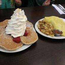 苺と生クリームとナッツがのったパンケーキと、本日のオムレツを頼みました。