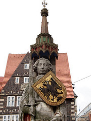 ブレーメンの世界遺産。ローラント像は市庁舎の前、マルクト広場の真ん中に立っています。その間をトラムが走っていてる様はなんか遊園地みたいです。このローラント像、自由の象徴だそうですが、なかなか愛嬌のある顔をしています。