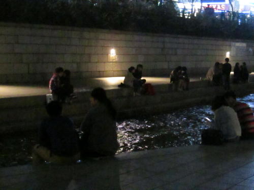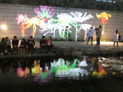 今回はソウルの桜を見る為に4月13日から16日の予定を立てましたが、余りの暖かさで4月の初めから咲いてしまい、着いた時には桜が散ってしまいました。わずかですが仁川の空港近くの高速道路沿いに桜が残っていました。バスの中から見て御終いです。夜に清渓川へ散歩に出かけました。暗い中を蠢くのは若いカップルばかり、老人4人組の来る所ではなさそうです。我々の時代には男女二人連れをアベックなんて言ったが今は死語だそうです。桜の代わりにカップルの花が満開でした。
