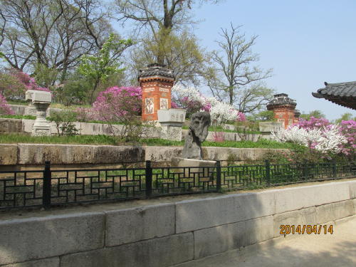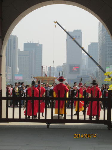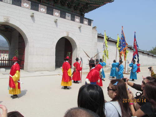 景福宮の王宮守門交代の儀式が大規模で迫力があります。桜はありませんが他の花が咲いています。王様が政務を執っていた宮殿です。