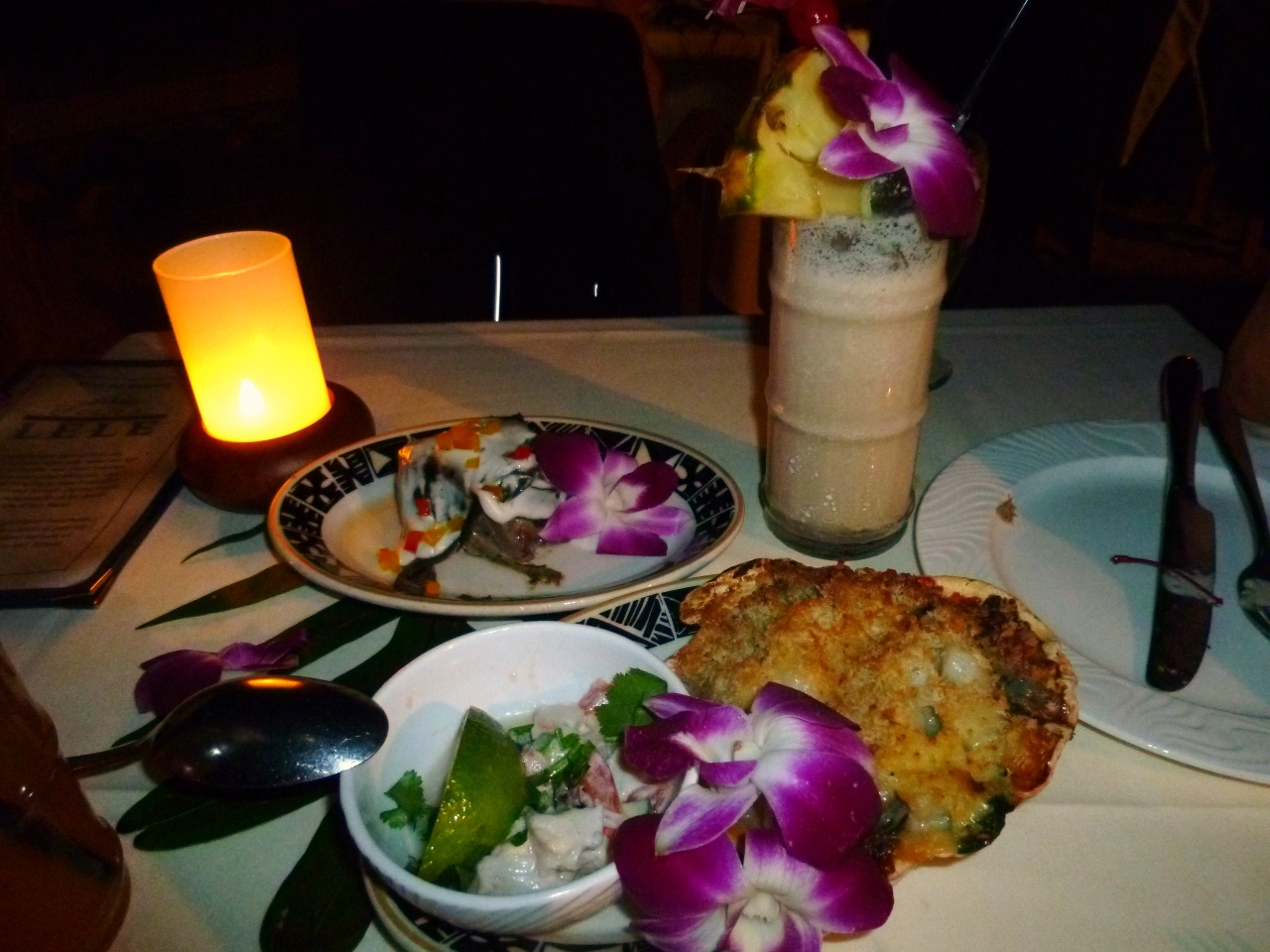 食事はステージの進行に合わせて、ハワイアンを踊る時はハワイアン料理、タヒチアンの時はタヒチ料理と出てくるのが楽しいです。ブッフェではなくテーブルサービスです。