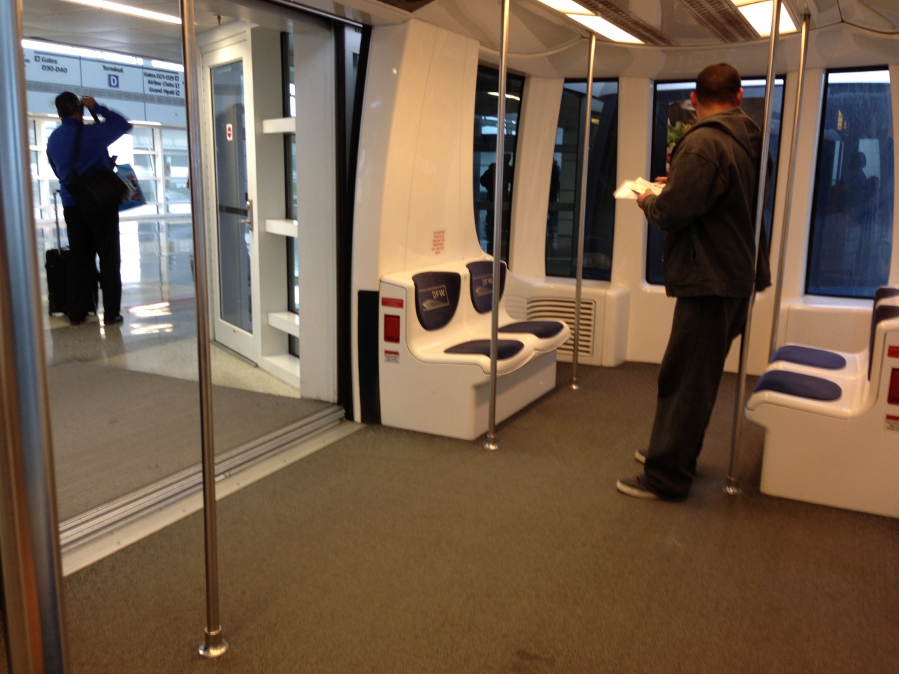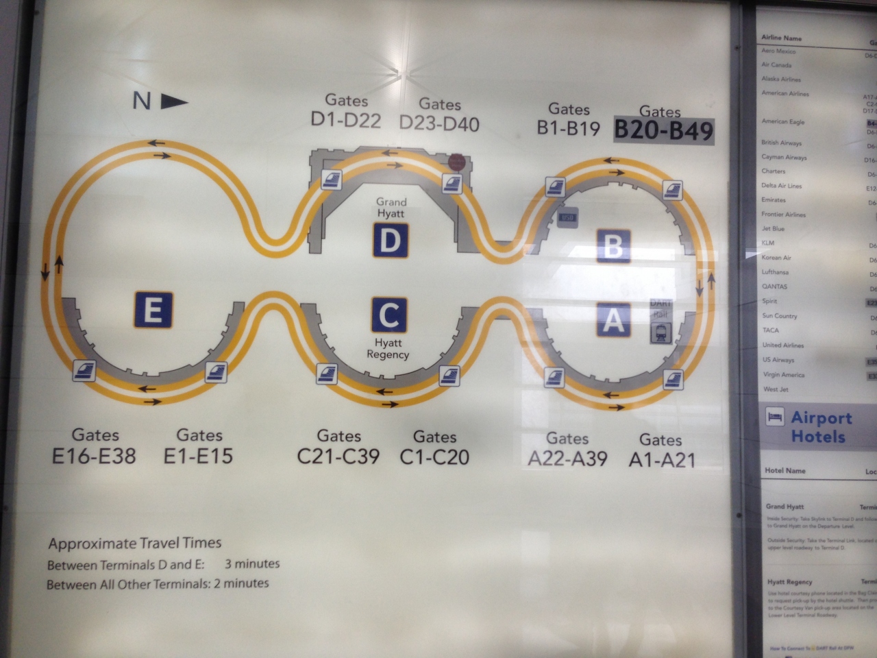 ダラス、フォートワース空港を利用した際、ターミナル間の移動に、スカイリンクを利用しました。この電車は、新交通システムの様な乗り物で、無人で運転されています。2, 3分間隔で運転されており、5つのターミナルを約20分で一周する様に結んでいます。