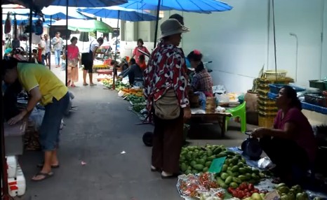 近在のお百姓さんたちが自作の野菜を持ってきて露天を開いているのでお買い得だ。