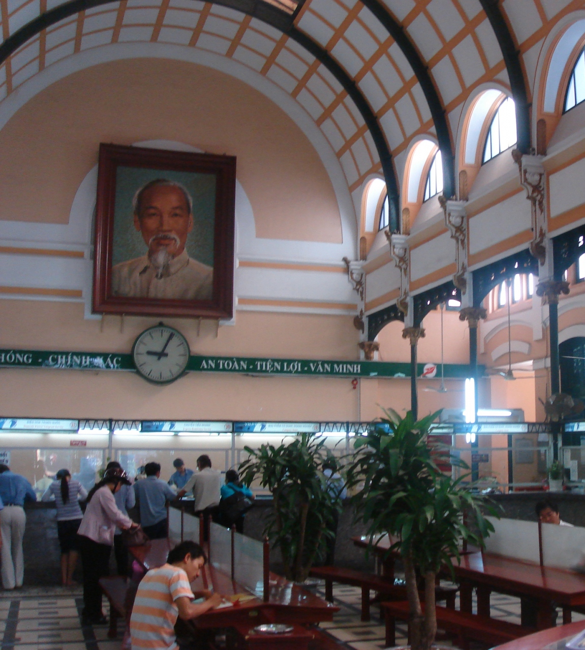ホーチミンの歴史ある美しい郵便局です。中に入るとまるでヨーロッパの美術館のような雰囲気、とても素敵です。とはいえ現行で郵便局として機能しているので、なんだか不思議な気分になすね。入ってすぐの左右にお土産屋さんもありました。