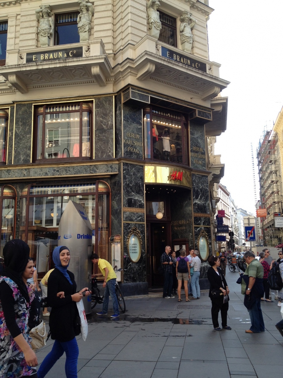 ウィーン随一の繁華街。旅行客であふれていて、活気があります。H&Mなどのファストファッションのお店もありました。多くのレストランがテラス席を出しているので街並みウォッチングかねてテラス席でお茶してみるのもよし。ただ、観光客向けのお店が多いのでお値段は高めのお店が多いです。
