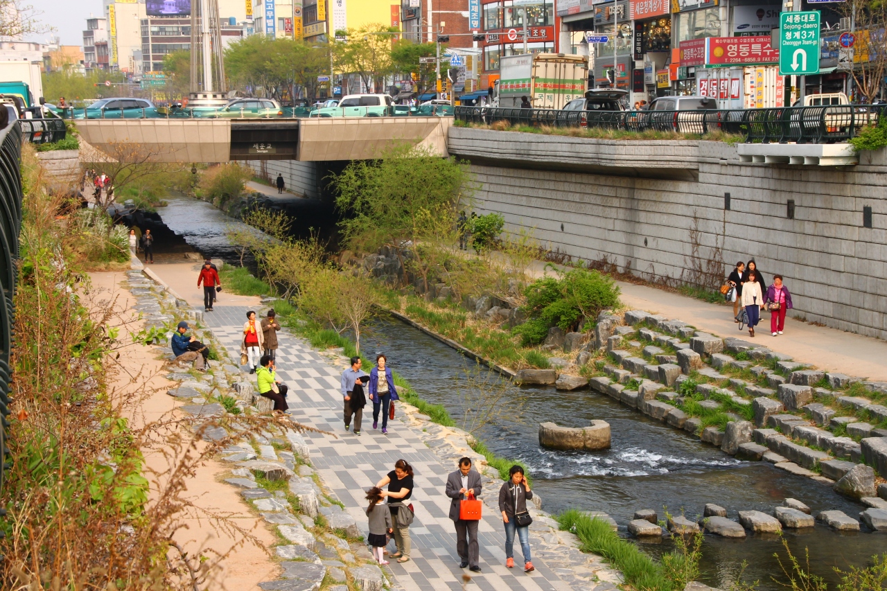 ソウルの中心部を東西に流れる人工河川です。両岸に遊歩道が整備されており、市民の憩いの場所になっています。所々に座れるスペースがあります。水も澄んでおり、鯉をはじめたくさんの魚が泳いでいました。位置を知る目印にもなるし、景色もきれいなので散策におすすめです。
