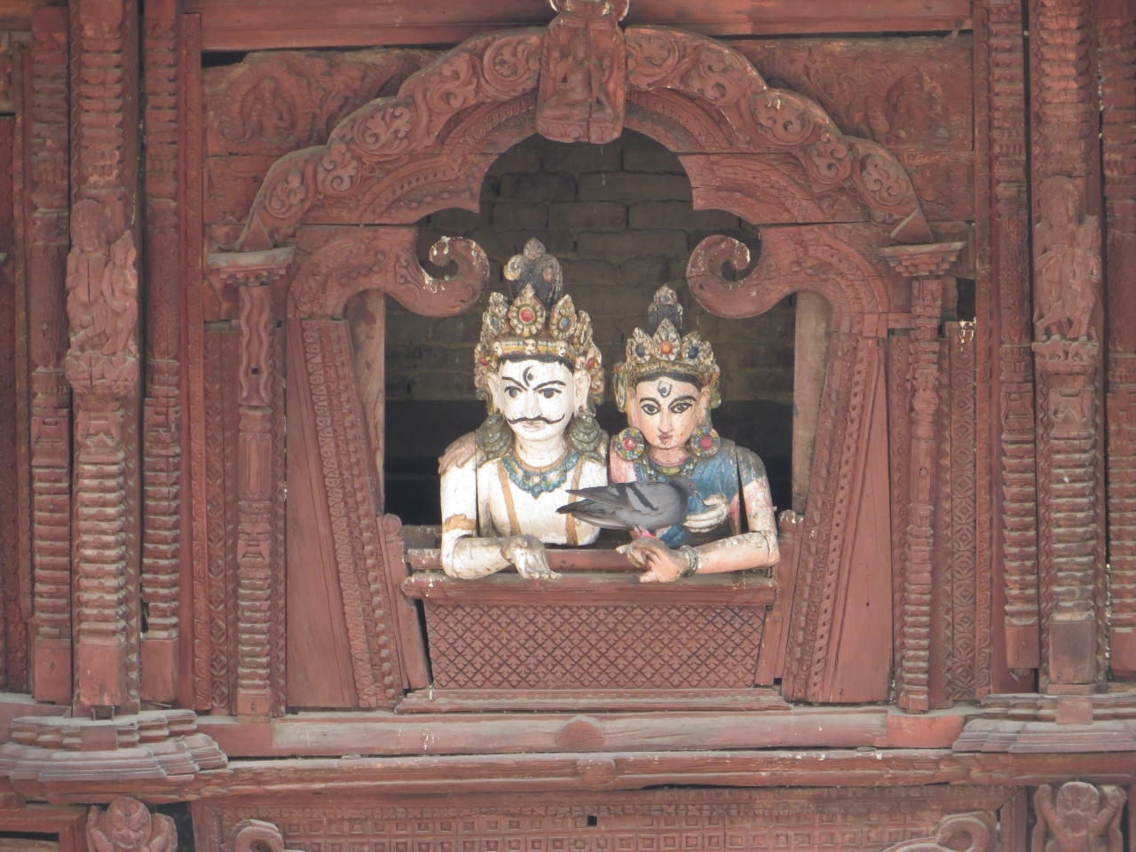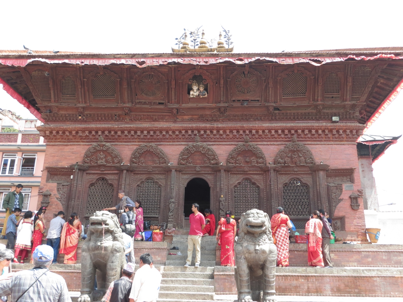カトマンズの同じダルバール広場内にあるこちらのシヴァ・パールバティ寺院の目の前でサリーを着た女性達が何やらバケツに水を張り、それを頭の上からサリーを着たまま全身に水を浴びることをしていたので、その光景に驚きました。何の儀式だったのかわかりませんでした。寺院の2階の外窓からシヴァとパールバティが仲良く並んで見下ろす姿が何ともキュートな姿をしていました。