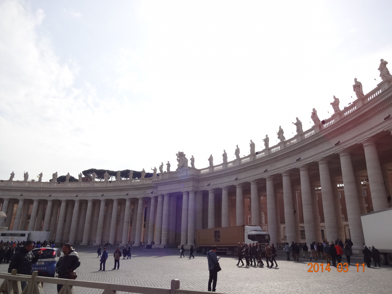 広場をグルリと囲むように、4列に並べられた石柱は合計372本もあって、柱の上には140体の聖人像が並んでいました。これは非常に見事で圧巻でした。