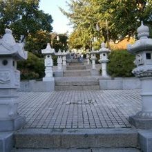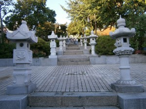 清日租界の境界階段。チャイナタウンは清国の租界と重なり、その東端に、旧日本人街の日本の租界との境界を示す階段があります。写真のように、左脇に中国式、右脇に日本式の石灯篭が並んでいます。境界線を燈籠の微妙な違いで表すなんて、おもしろいですよね!