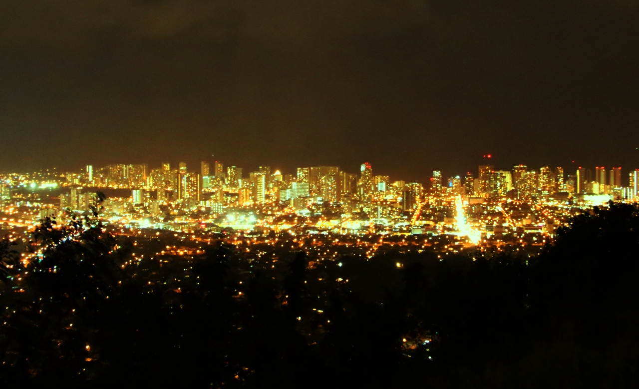 夜景は綺麗なのだが…この自然の美しい島に人工的な灯りの洪水はふさわしいのか否か…。カメハメハ大王も天の上でビックリして眺めているんだろうな…