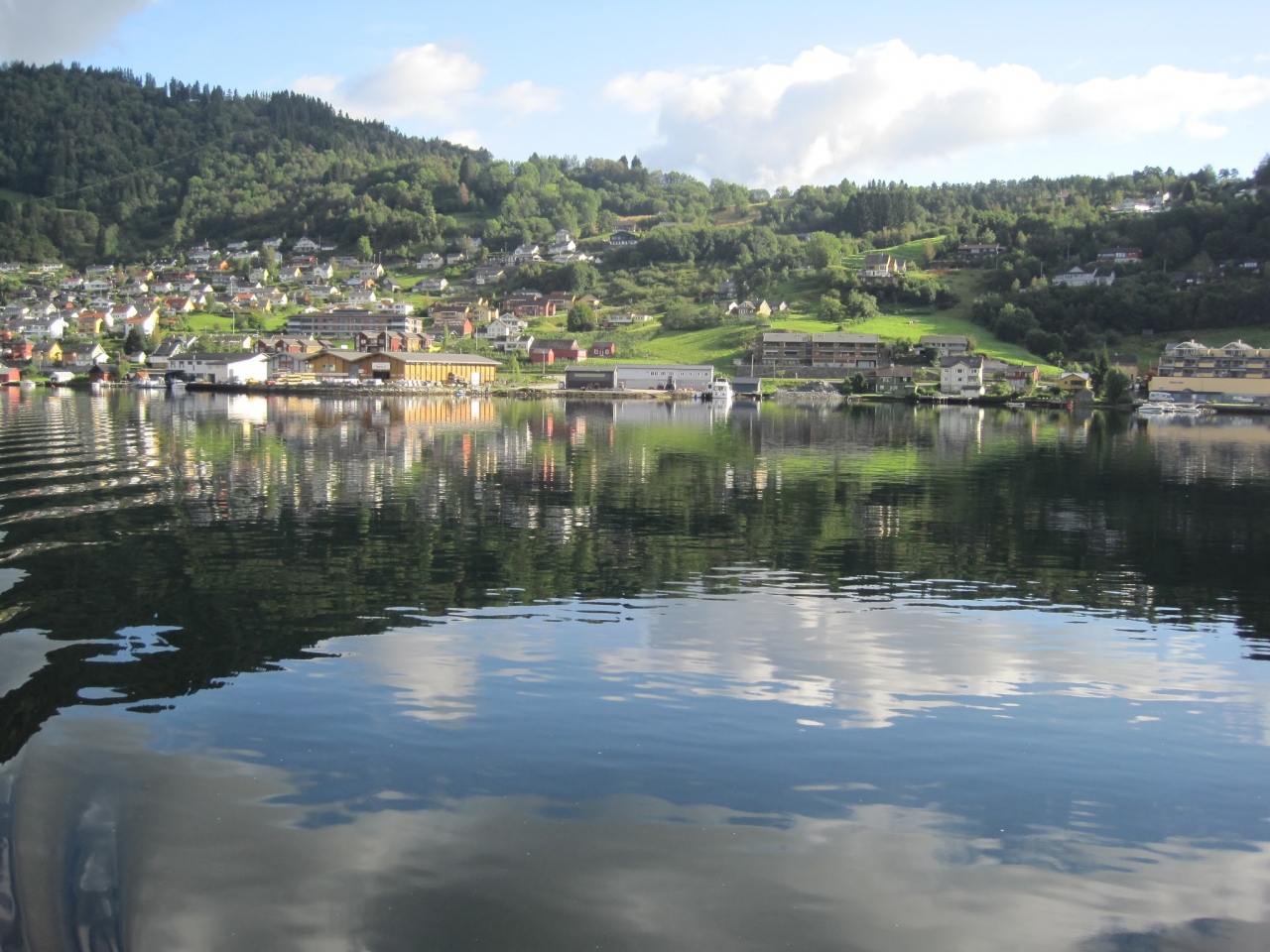 ノールハイムスンからのハダンゲルフィヨルドを見るための船に乗るために、ベルゲン市内からバスに乗りました。バスターミナルまでホテルからタクシーで行きましたが、バス停がたくさんあり、該当バスの場所が、ちょっと分かりにくかったです。8月の観光シーズンだったためか、朝早くのバスでしたが、ほぼ満席で席の選択肢もあまりなくなっていたので、バス発車時刻に余裕を持って到着することをお薦めします。街を抜けると素晴らしい景色が広がっていて、フィヨルドへの期待が高まりました。