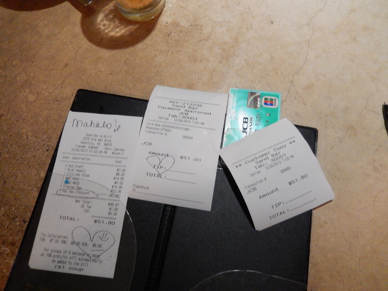 高級な料理を求めるなら、お金次第で限度無く楽しめるワイキキのキュィジーヌ事情の中で、いくらカジュアルなメニューと言えども、この料金設定は安いと言える。 反面的に言うならば、大したことも無い料理なのに、ビーチサイドにあるという環境から高い料金を請求する店も少なくないのだから、少し奥まった場所にあるとは言え、アメリカンな雰囲気は十分だし、この店の料理と価格設定は十分に満足できるものだと思う。