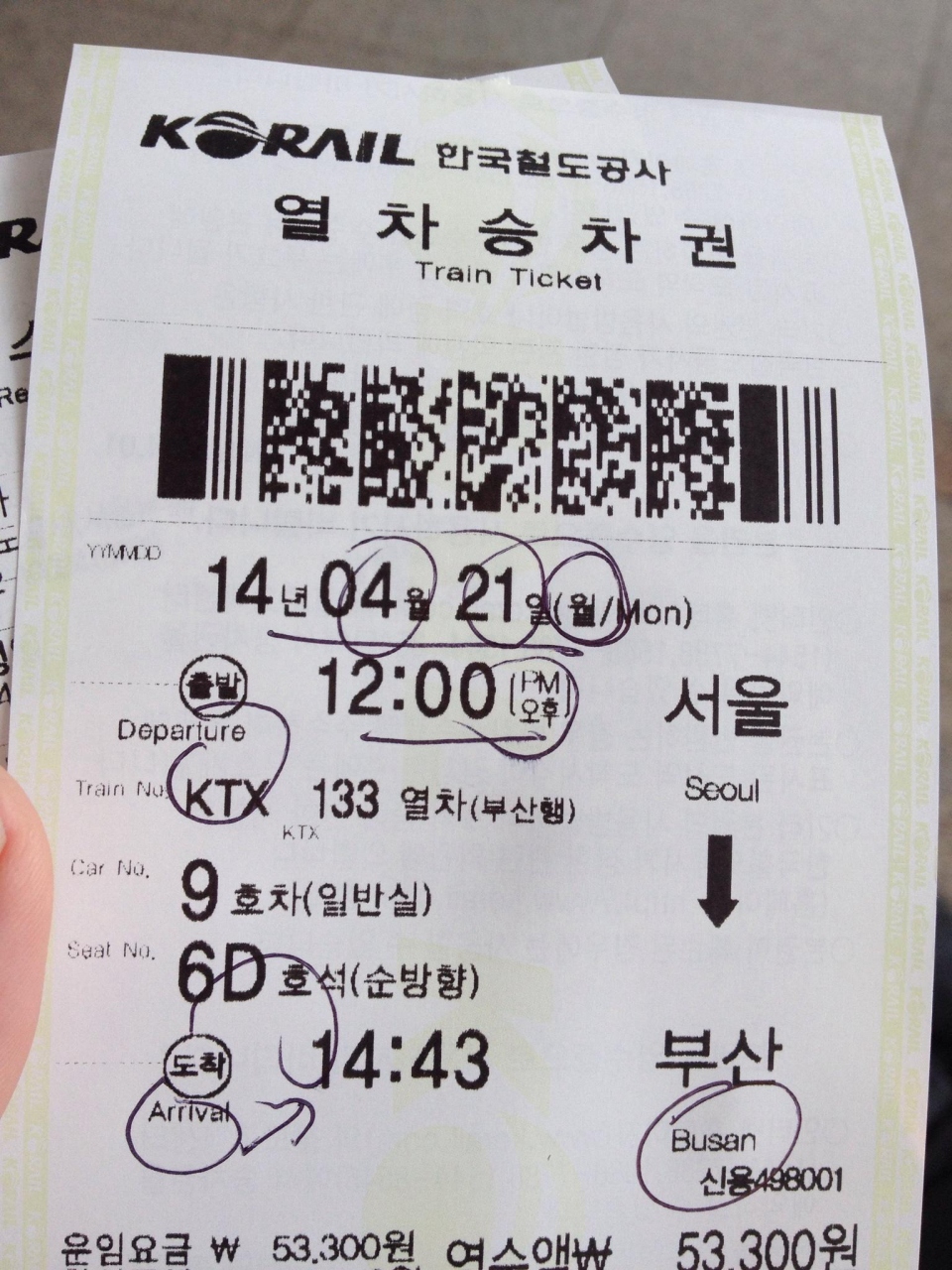 KTXでソウル駅から釜山駅まで行きました。