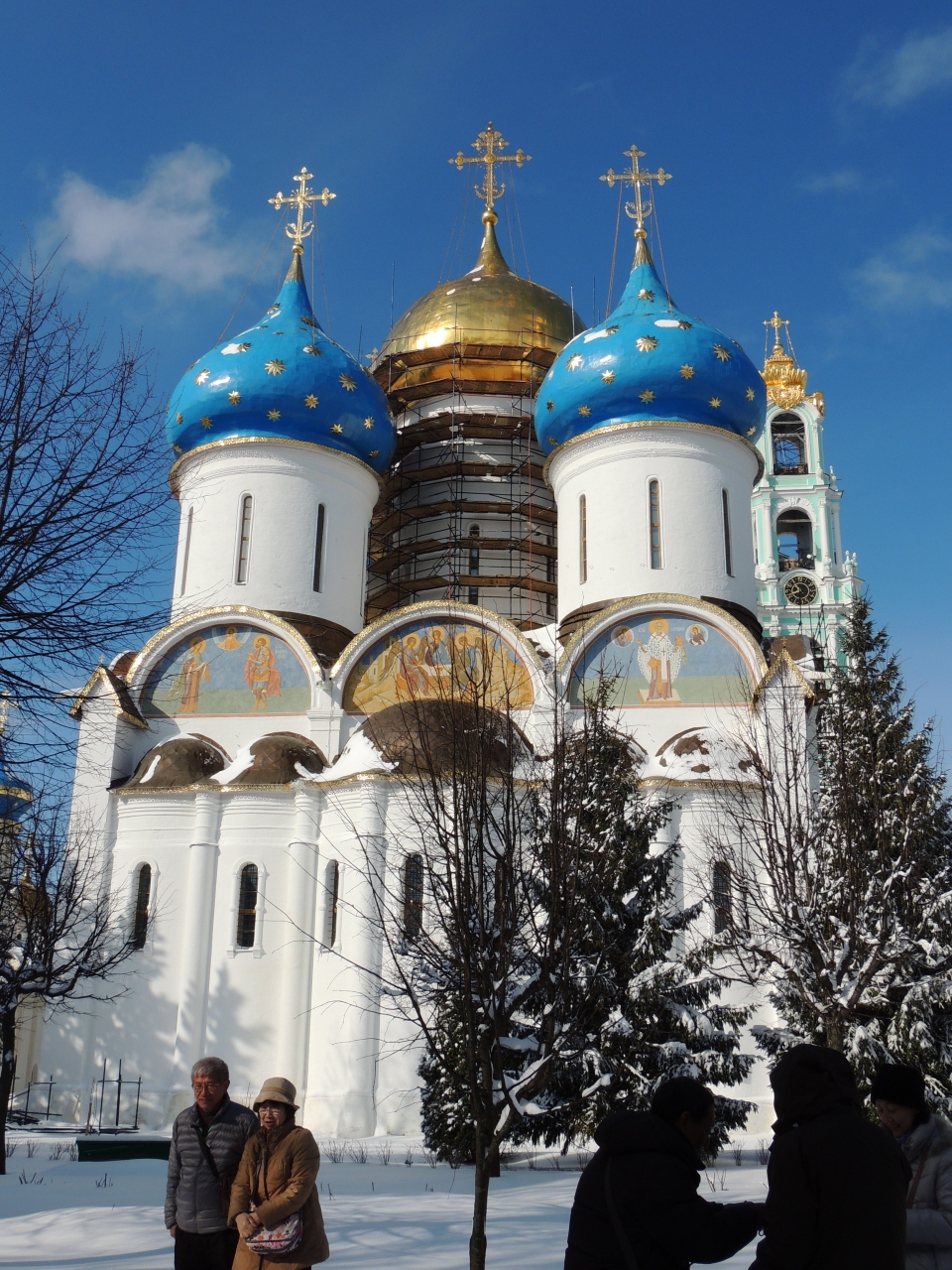 朝から雪景色の中をドライブし、到着すると青空が出てきて、青や金色の屋根の写真がきれいに撮れました。入場の際に写真撮影料100ルーブルを払うとCDがもらえます。熱心な信者が数多く訪れていてミサも行われていました。