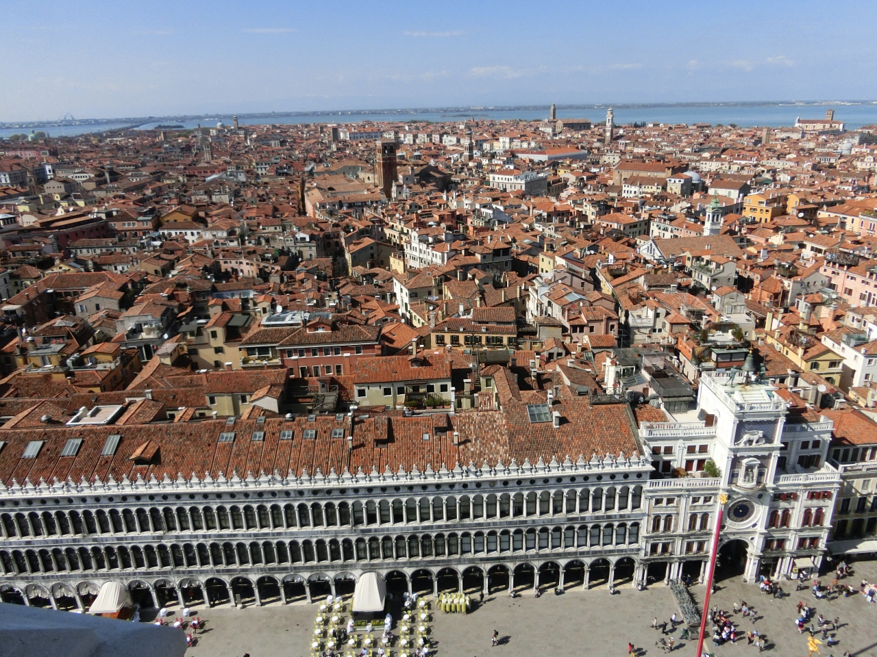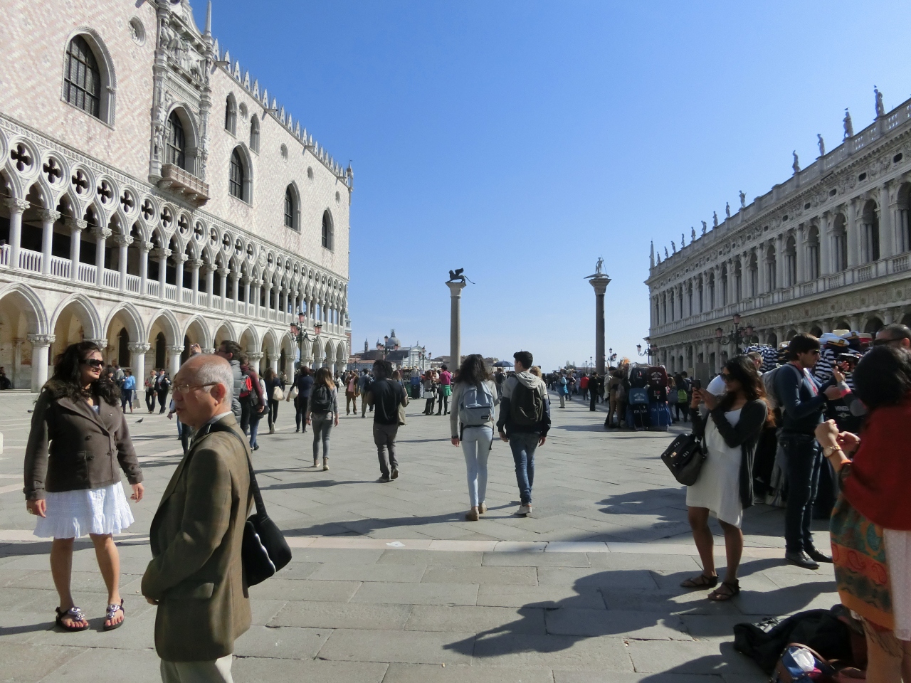 海の方からサンマルコ広場の方を見ると、大きな時計があるではないか?